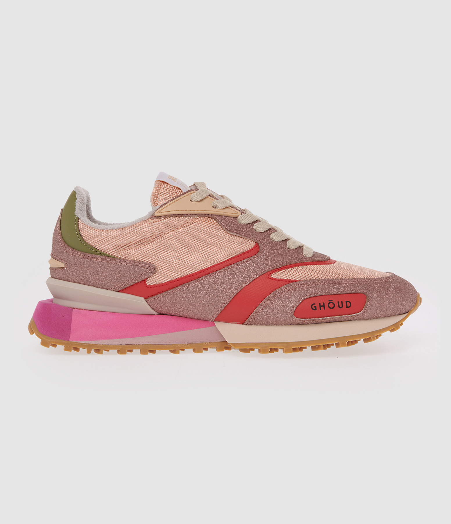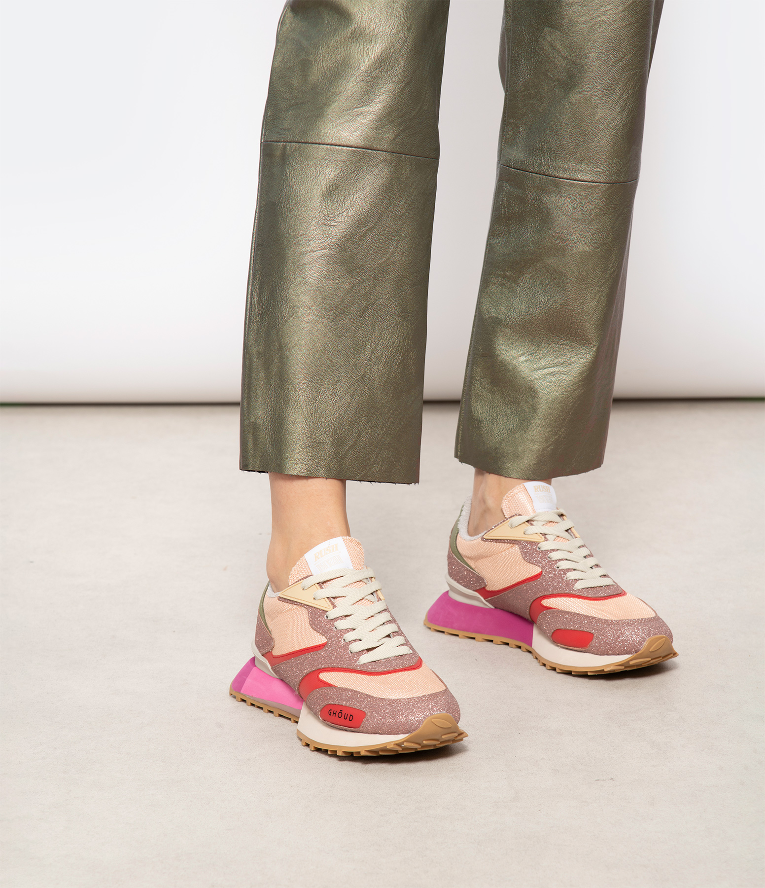 Baskets running multi-matière en mesh rose, rouge et en paillettes roses avec des empiècements contrastants. Renfort talon en cuir lisse kaki. Semelle en caoutchouc multicolore. Lacets beiges. Intérieur en cuir et maille bouclette.