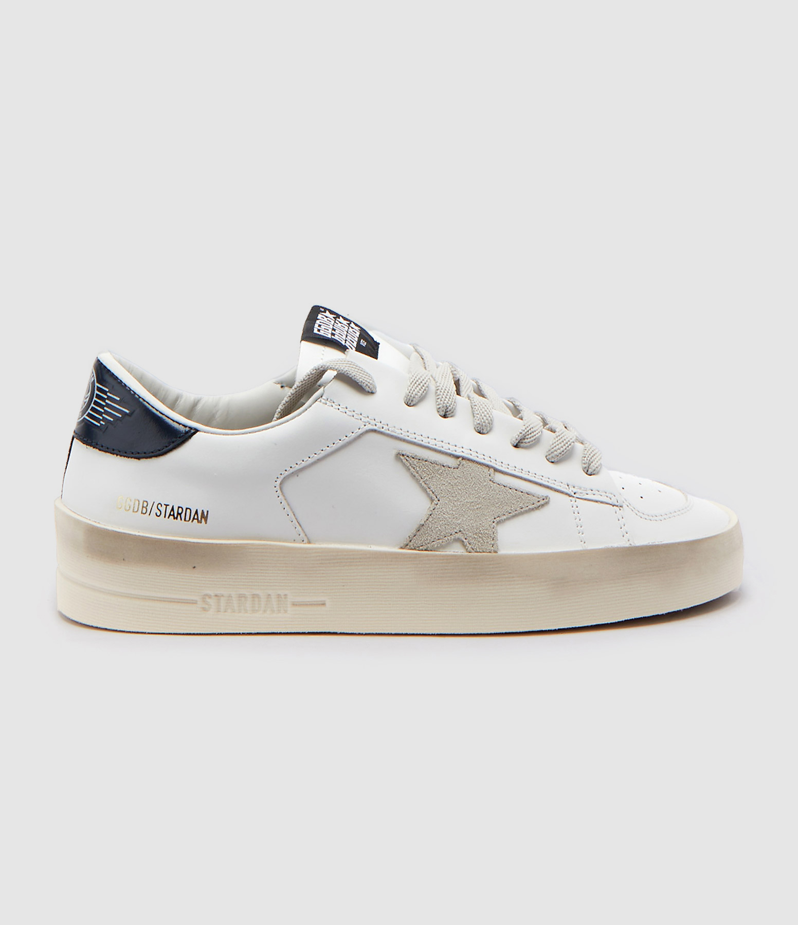 Baskets basses en cuir lisse blanc. Empiècement étoile en cuir suédé gris. Renfort talon en cuir lisse noir avec logo "Stardan". Inscription "STARDAN" sur la semelle extérieure droite et "GGDB/STARDAN" sur le côté extérieur du pied droit. Intérieur en cuir et maille bouclette.