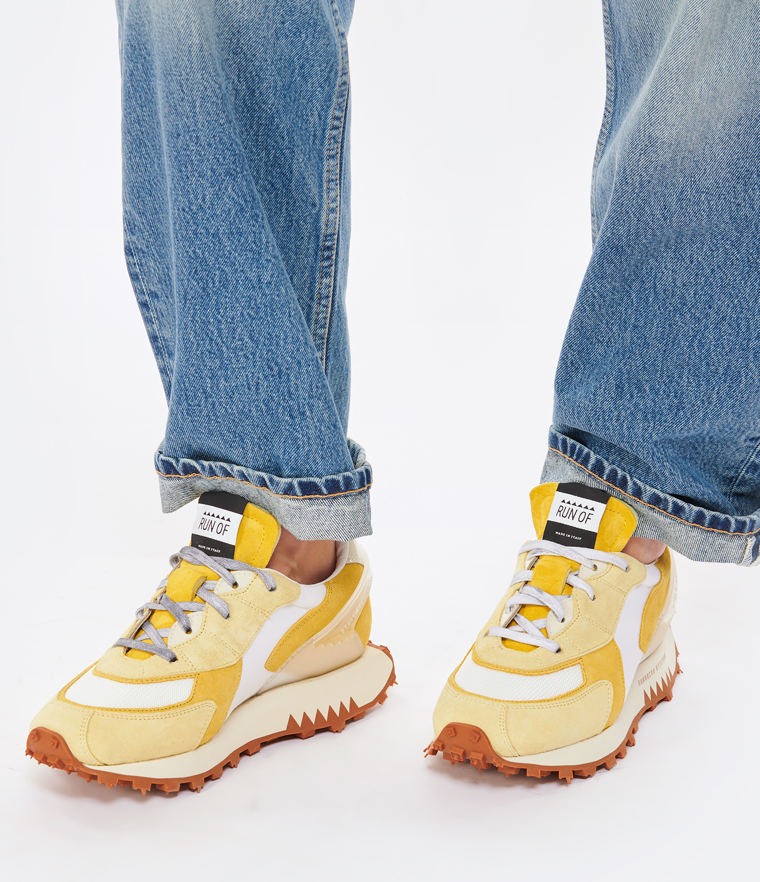 Baskets running jaune à empiècements contrastants multi-matières. Renfort en plastique transparent au talon. Lacets gris. Semelle en caoutchouc crantée.