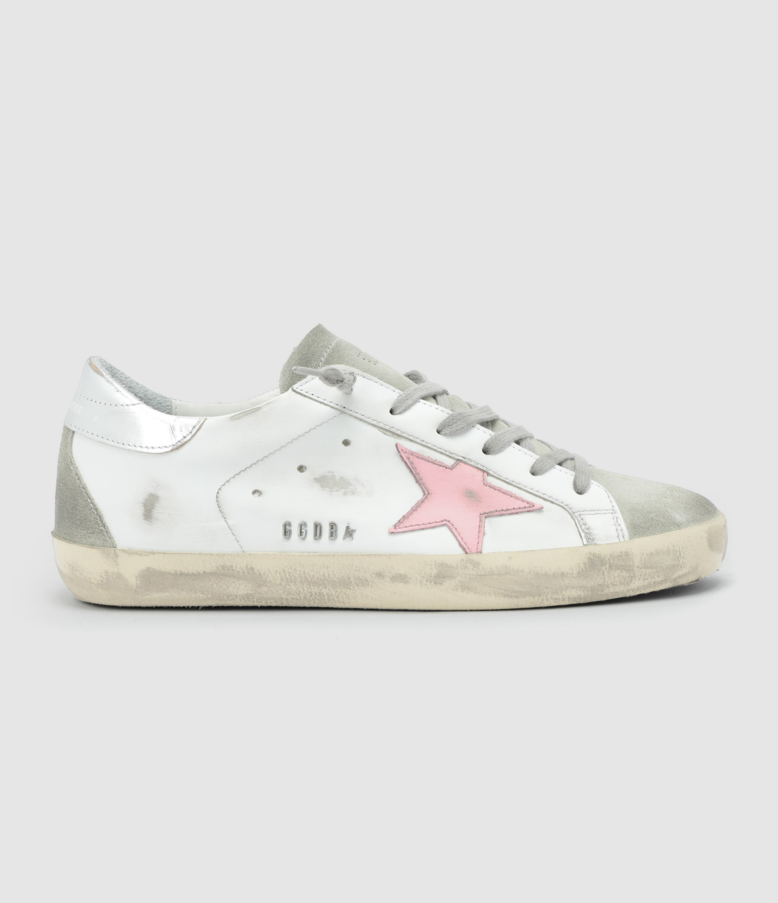 Baskets basses en cuir lisse blanc. Empiècement étoile en cuir lisse rose. Renfort talon en cuir argenté. Languette en cuir suédé gris. Lacets gris. Intérieur en maille bouclette et cuir. Inscription "GGDB/SSTAR" sur le côté extérieur.