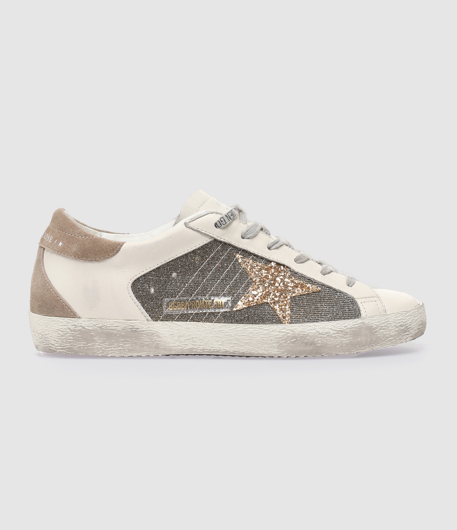 GOLDEN GOOSEBaskets Super-star Cuir Blanc Doré Taupe, Exclusivité Lulli