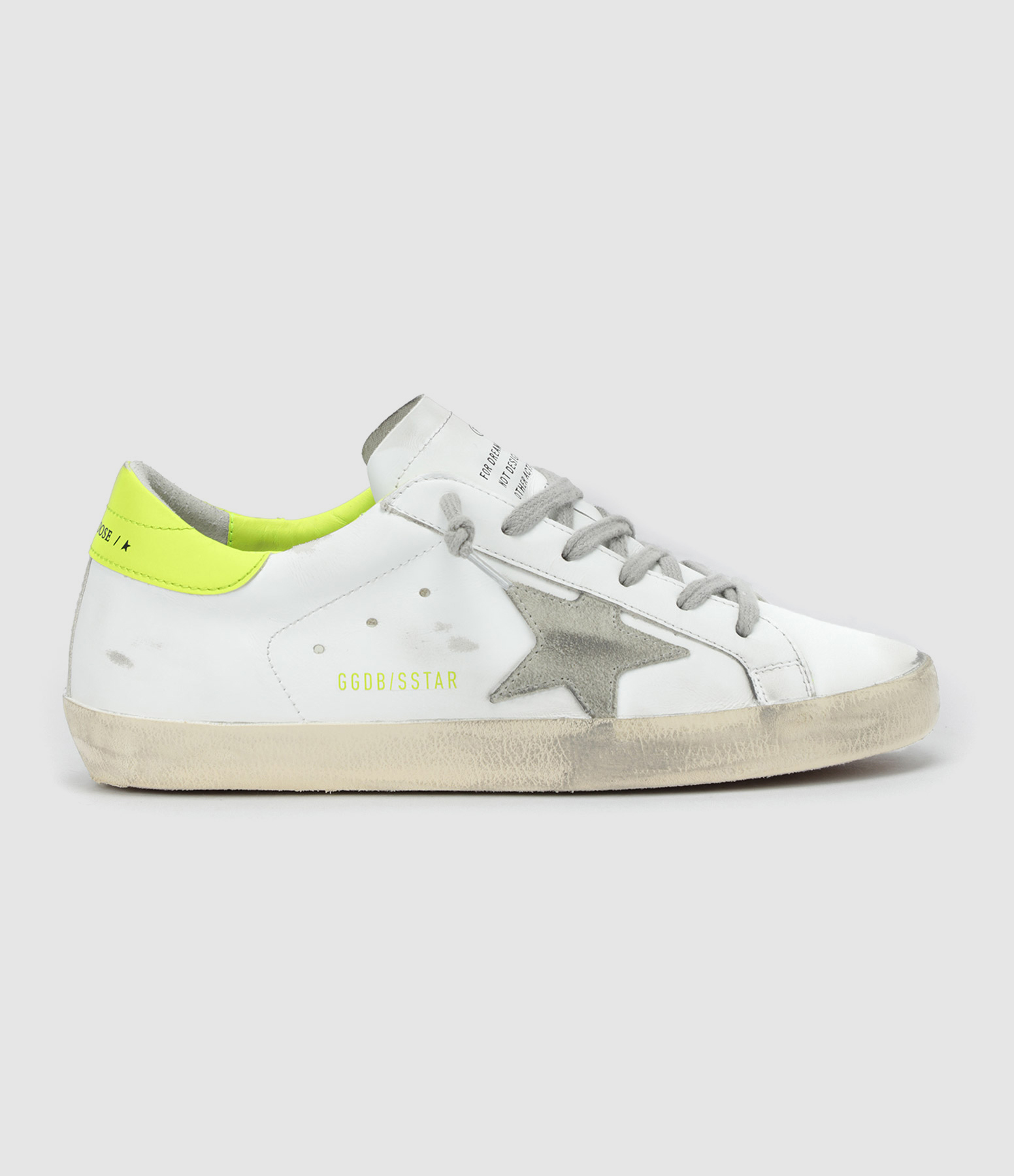 Baskets basses en cuir lisse blanc. Empiècement étoile en cuir suédé gris. Renfort talon en cuir lisse jaune fluo. Lacets gris. Intérieur en cuir et maille bouclette. Inscription "GGDB/SSTAR" sur le côté extérieur.