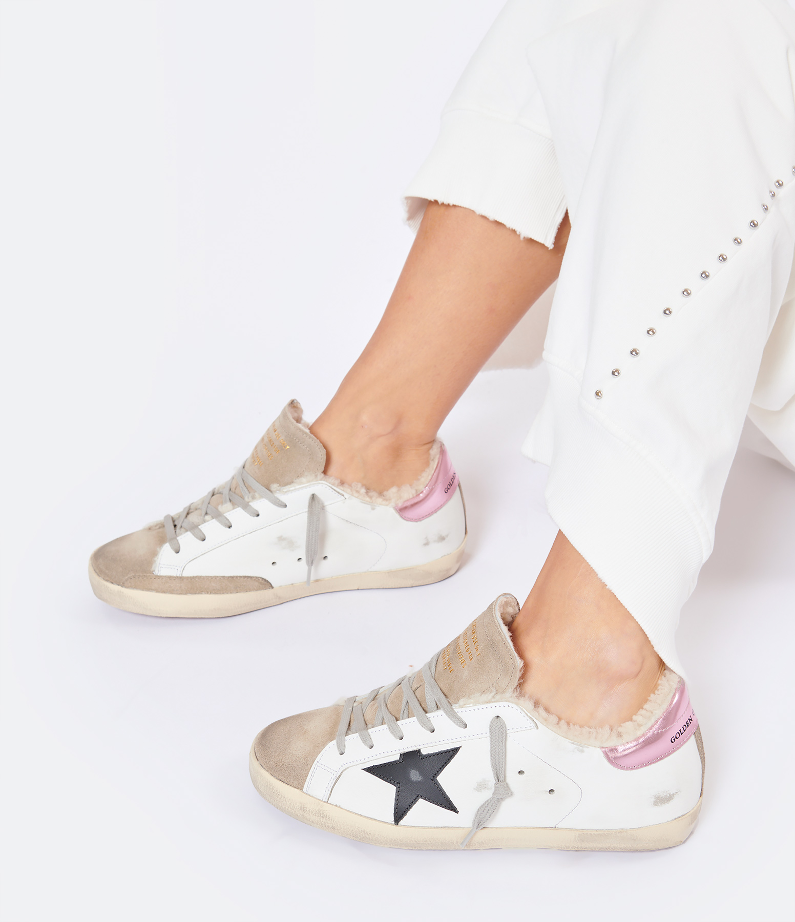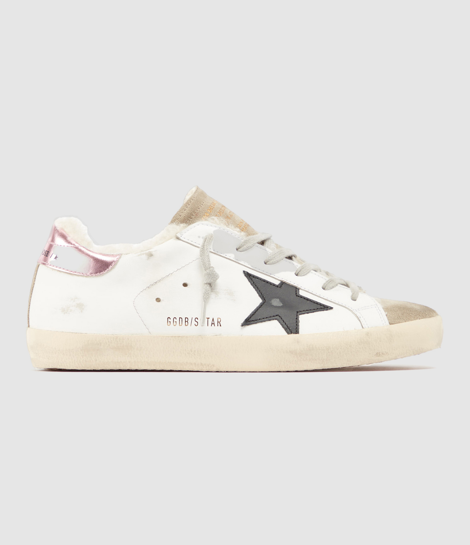 Baskets basses en cuir lisse blanc doublées en shearling. Languette en cuir suédé gris avec inscription "For dream use only not designed for other activities Golden Goose property" embossée en doré. Lacets gris. Logo étoile en cuir lisse noir. Inscription "GGDB/SSTAR" en doré sur le côté extérieur. Renfort talon en cuir lamé rose estampillé GOLDEN GOOSE en noir. Semelles beiges.
