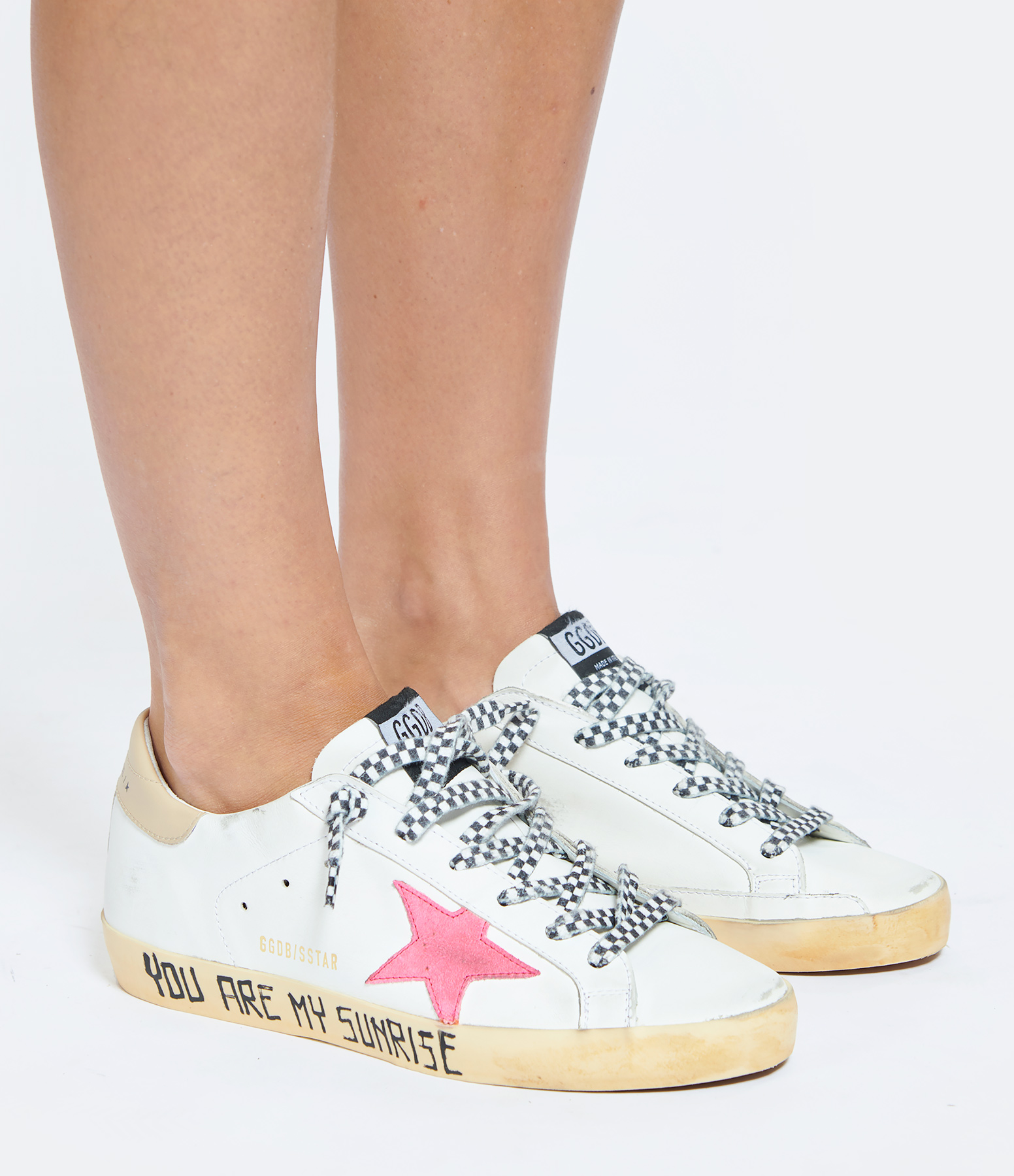 Baskets basses en cuir lisse blanc avec empiècement étoile rouge fluo et renfort talon en cuir beige. Inscription "YOU ARE MY SUNRISE" sur la semelle. Lacets à damiers. Intérieur en cuir et en maille bouclette.