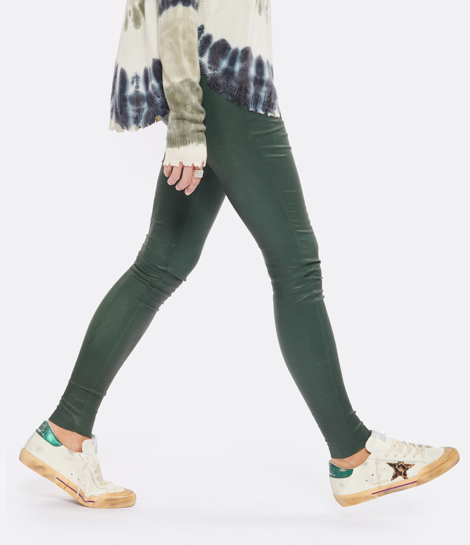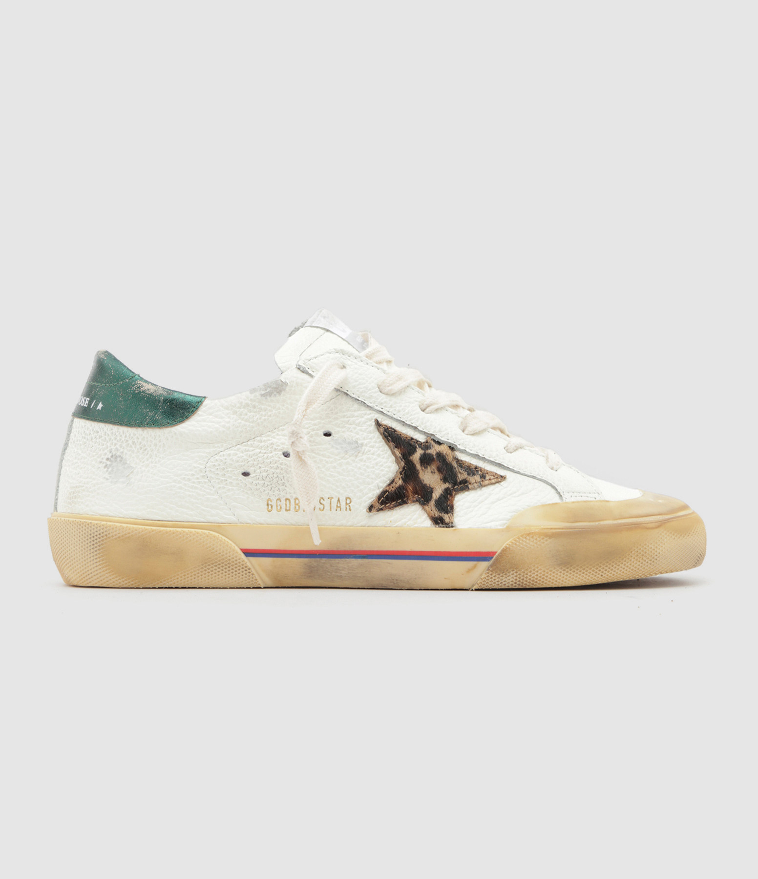Baskets basses en cuir grainé blanc. Empiècement étoile en cuir pony léopard. Renfort talon en cuir vert. Lacets blanc. Intérieur en maille bouclette et cuir. Inscription "GGDB/SSTAR" sur le côté extérieur.
