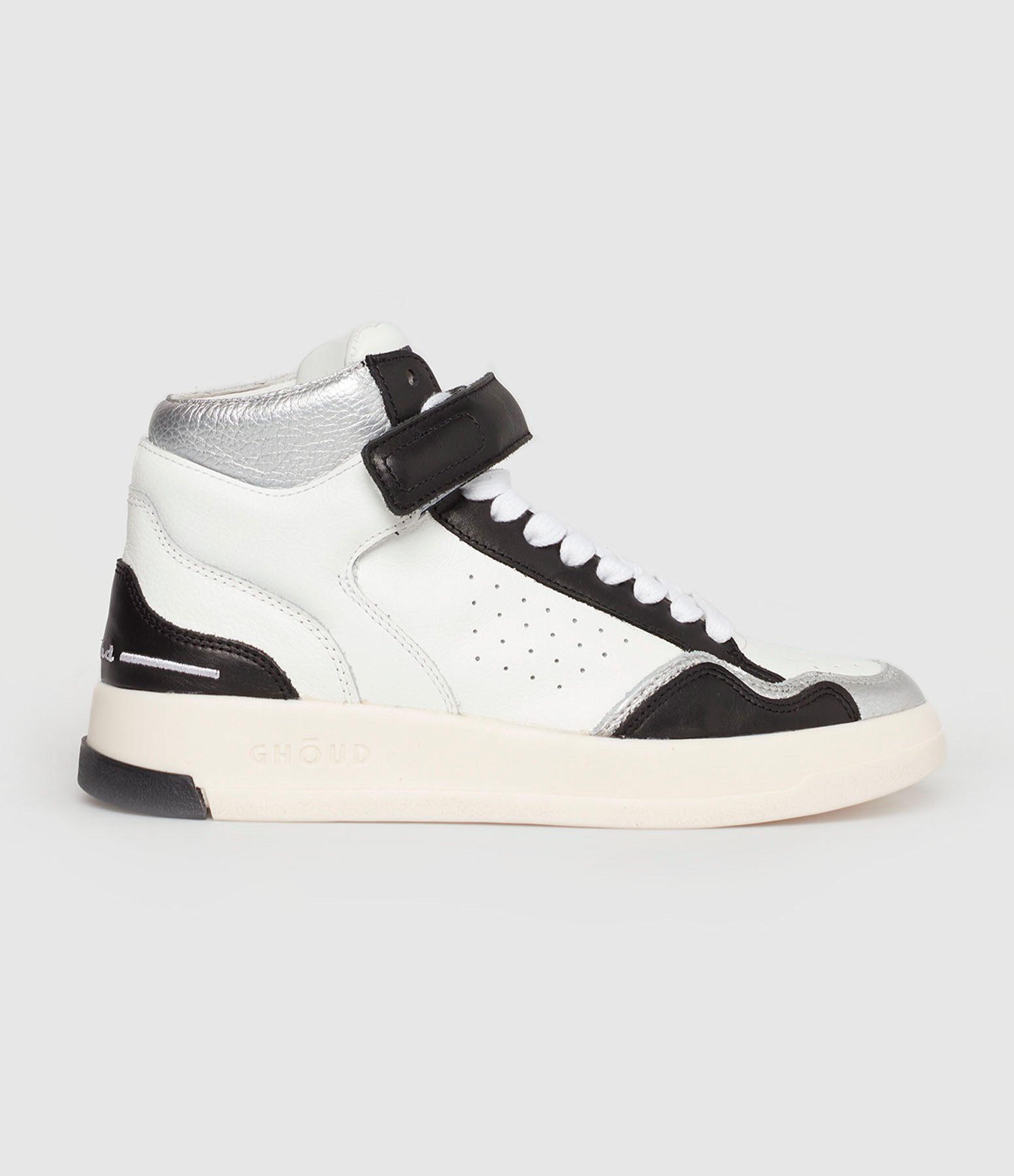 Baskets montantes en cuir lisse blanc, noir et argenté.