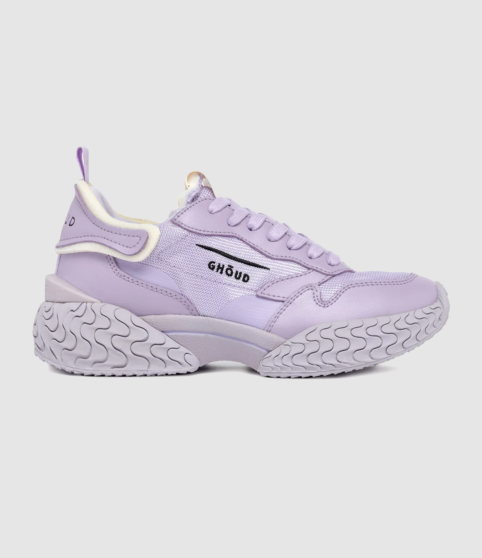 Baskets en mesh violettes avec empiècements en cuir ton sur ton. Lacets violets. Renfort talon en cuir suédé noté GHOUD. Semelle épaisse à motifs.