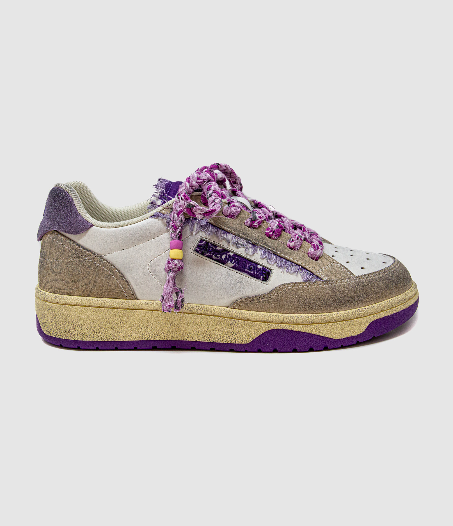 Basket en cuir écru. Empiècement en daim gris et violet. Lacet en bandana.