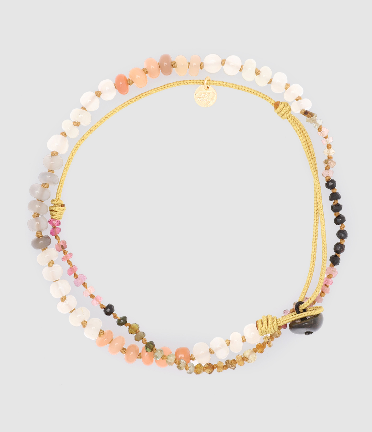 Bijou 3en1 sur cordon doré orné de pierre de lune et tourmaline. Grâce à sa boucle de réglage le bijou se porte en bracelet, bracelet de cheville et collier.