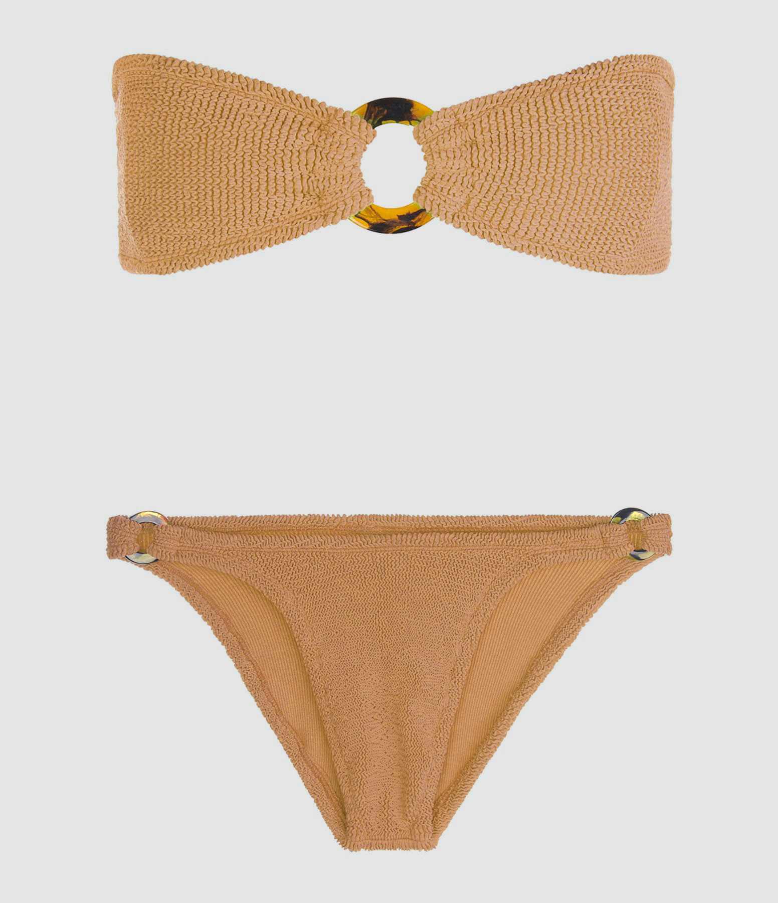 Maillot de bain deux pièces en crépon marron. Haut bandeau extensible avec un anneau au milieu. Culotte échancrée extensible avec un anneau de chaque côté.