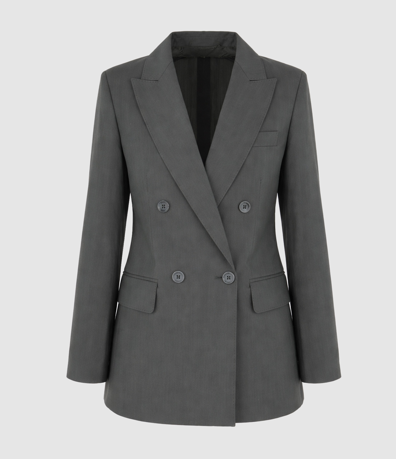 Blazer à double boutonnage en popeline légère de laine et soie, à texture chevron, coupe droite avec fentes au dos, col à revers en pointe et poches passepoilées à rabat.
