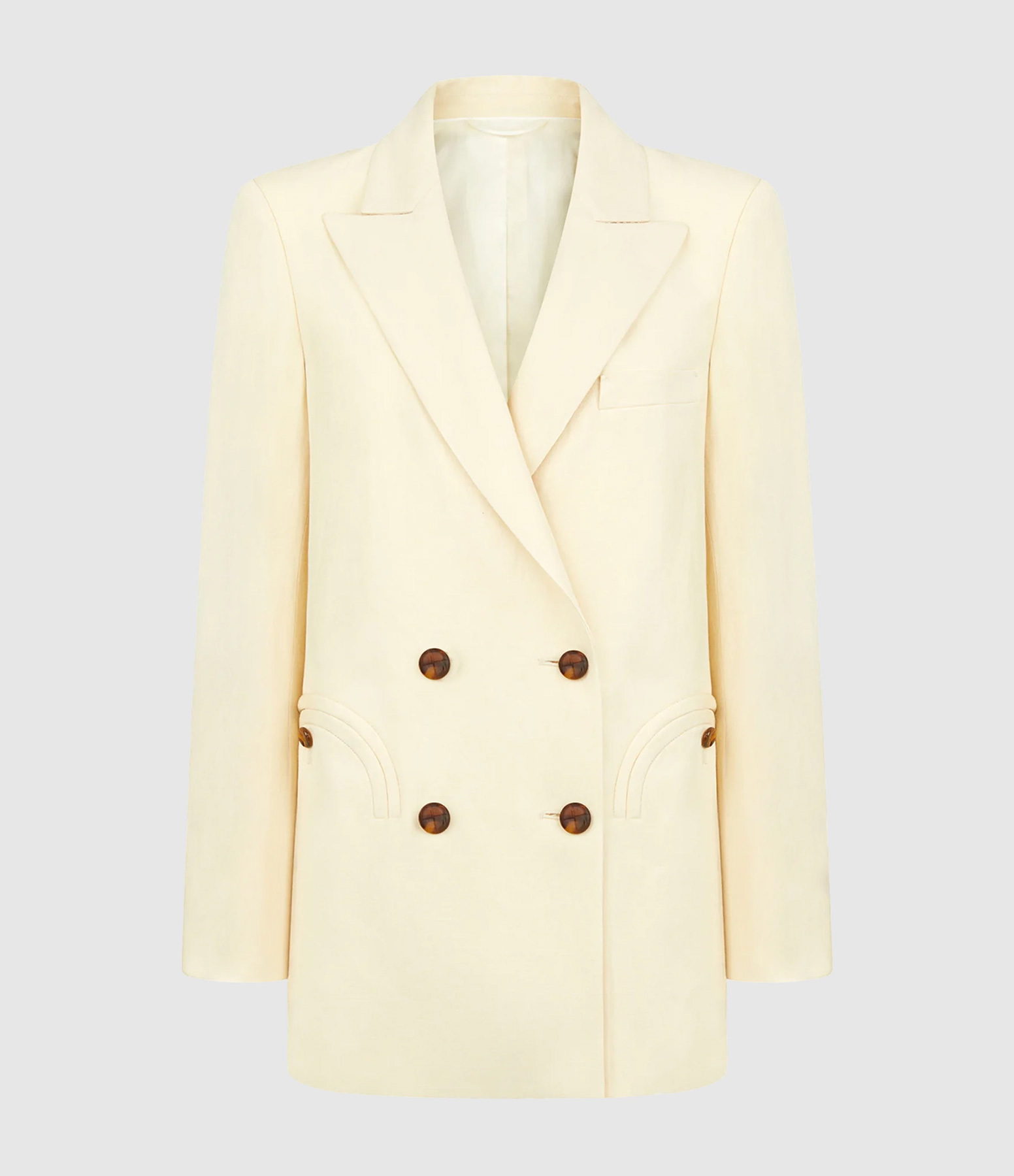 Blazer croisé en lin et soie couleur beurre. Veste croisée. Coupe standard avec épaules légèrement rembourrées. Coupe droite à la taille. Doublure couleur crème. Boutons inspirés du loden. Revers pointus. Fente d'aisance au dos. Poches extérieures à motifs et quatre poches intérieures.
