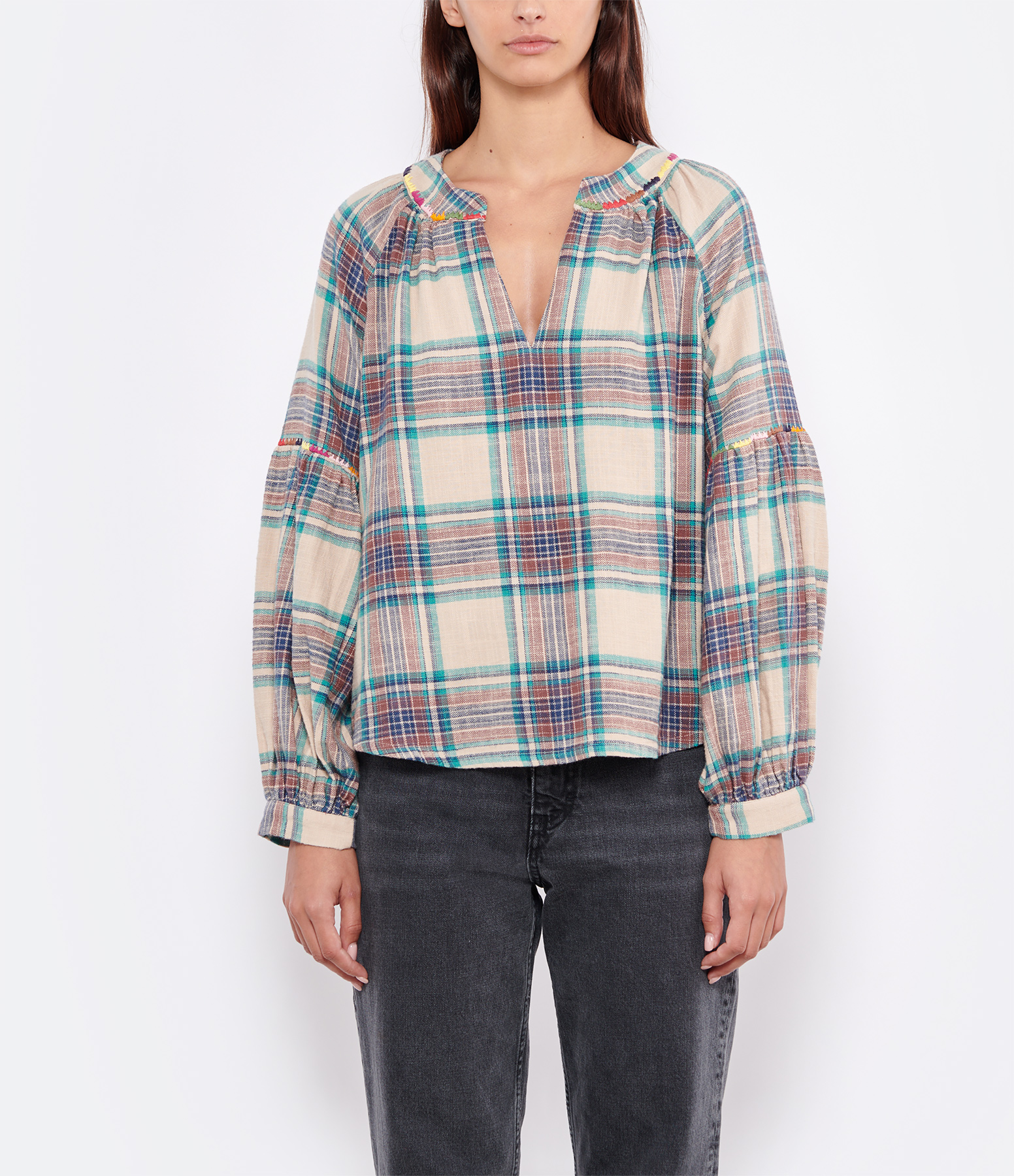 Blouse en coton à carreaux dans les tons bleus et beige. Col rond ouvert bordé de broderies multicolores. Fronces au col et dans le dos. Manches longues ballon brodées et resserrées aux poignets. Coupe droite. Base arrondie.