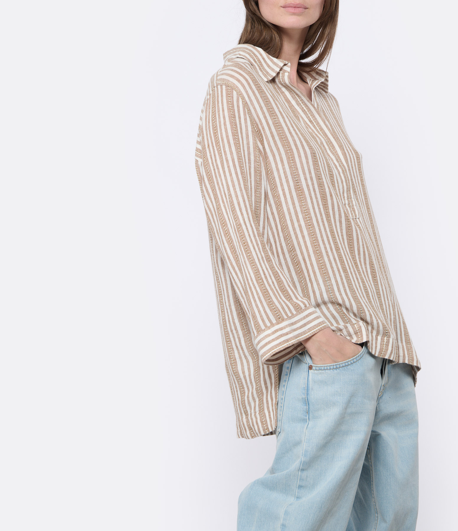 Chemise en lin à rayures blanches et marrons. Col chemise, avec encolure boutonnée. Manches longues resserrées aux poignets. Coupe droite. Base droite.