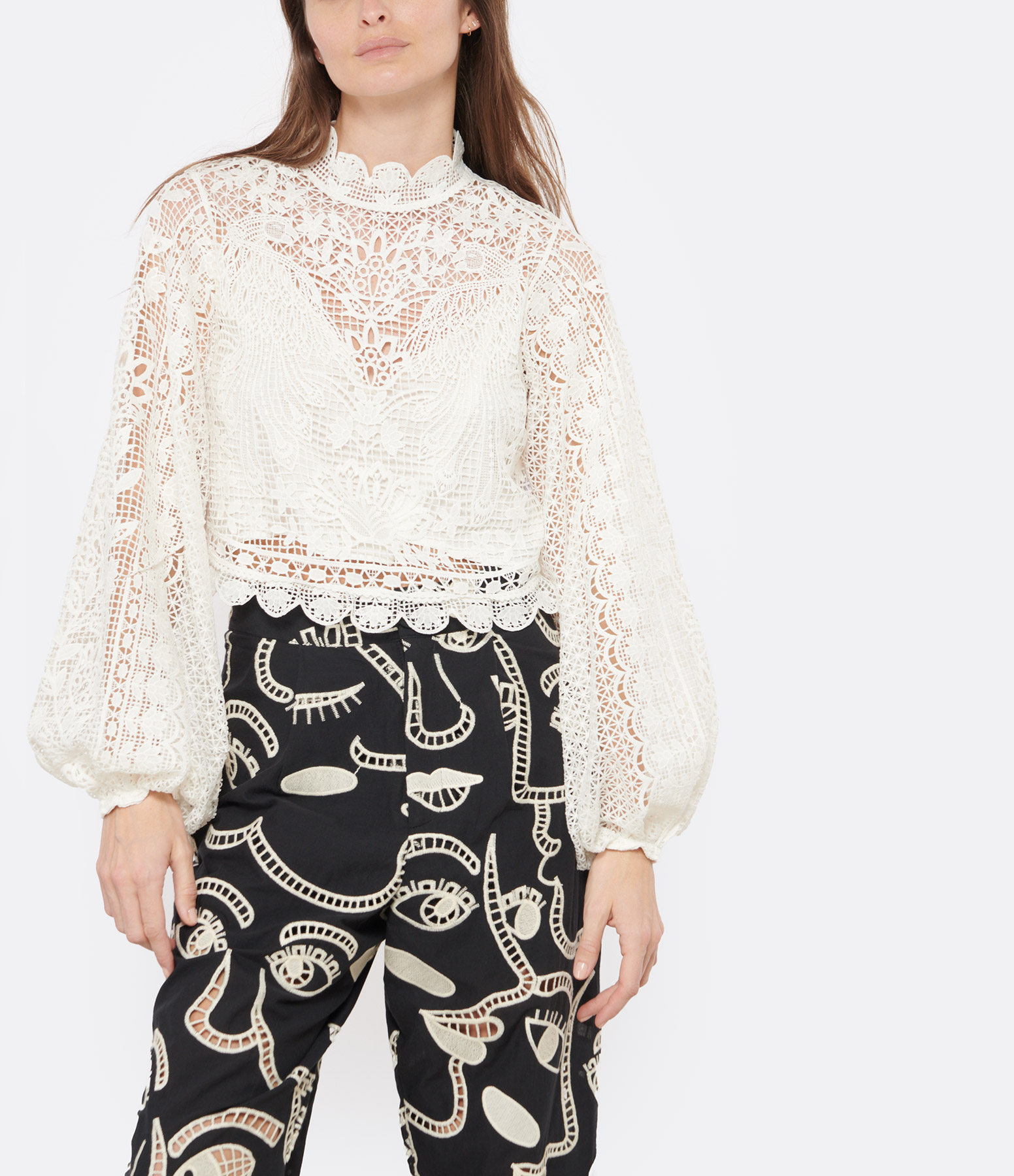 Blouse brodée ajourée blanche. Col haut asymétrique. Manches bouffantes. Zip invisible au dos. Coupe crop droite. Base asymétrique.