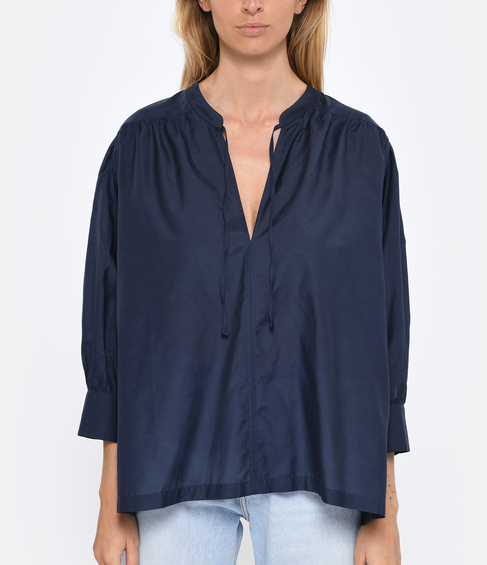 Blouse en coton bleu marine. Manches longues resserrées par boutons aux poignets. Col en V avec lien de serrage. Coupe large. Base droite.