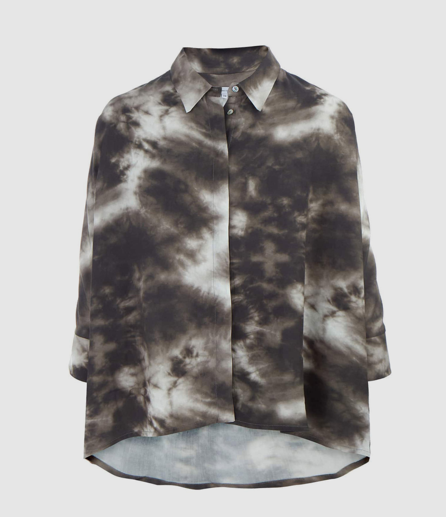 Blouse oversize à imprimé tie & dye noir et blanc. Col chemise. Manches 3/4 effet chauve souris. Fermeture par boutons. Coupe ample. Base arrondie. Plus longue à l'arrière.