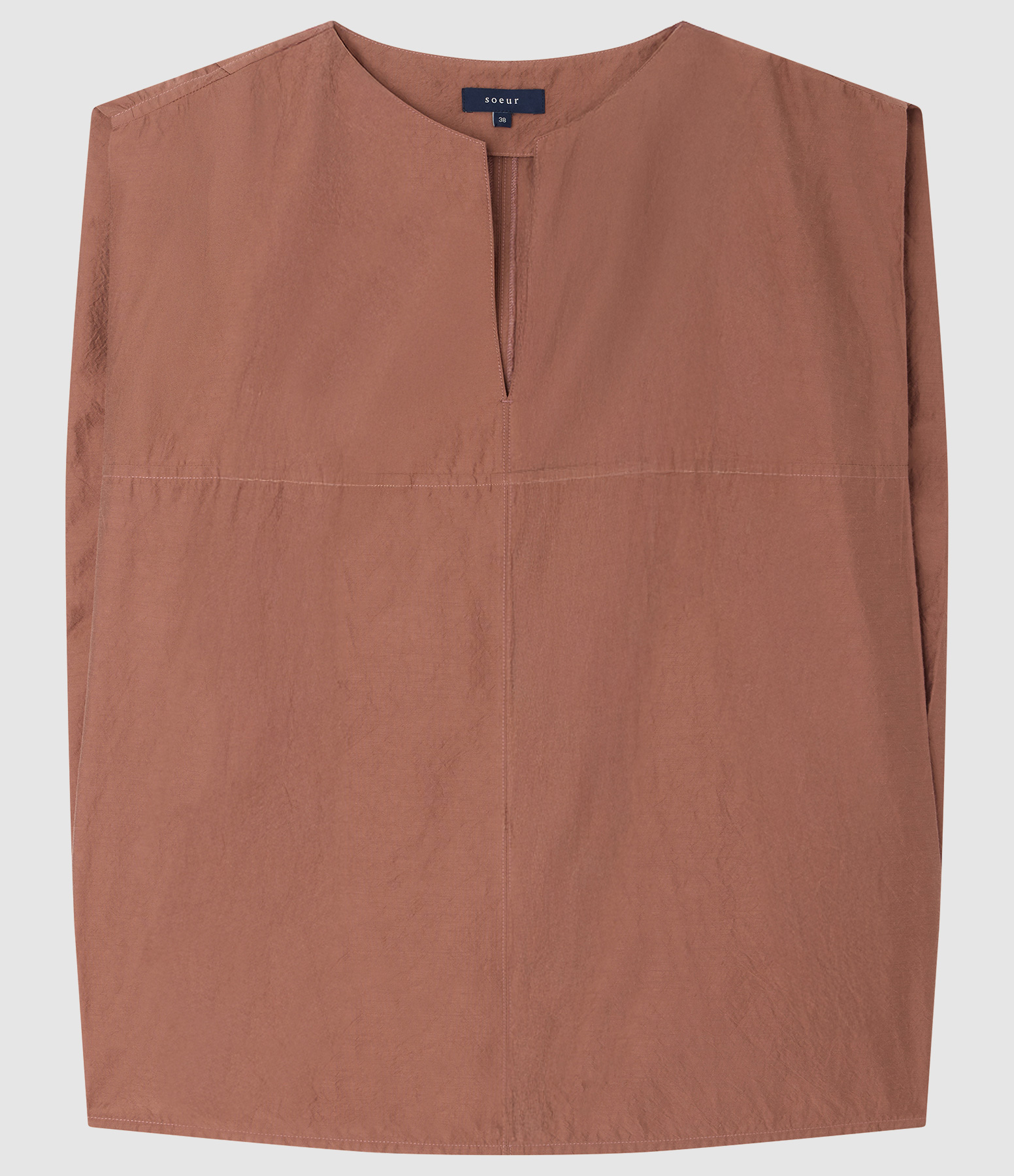 Top sans manches en popeline de coton vieux rose. Coupe ample. Col ouvert. Travail de soufflet aux côtés.