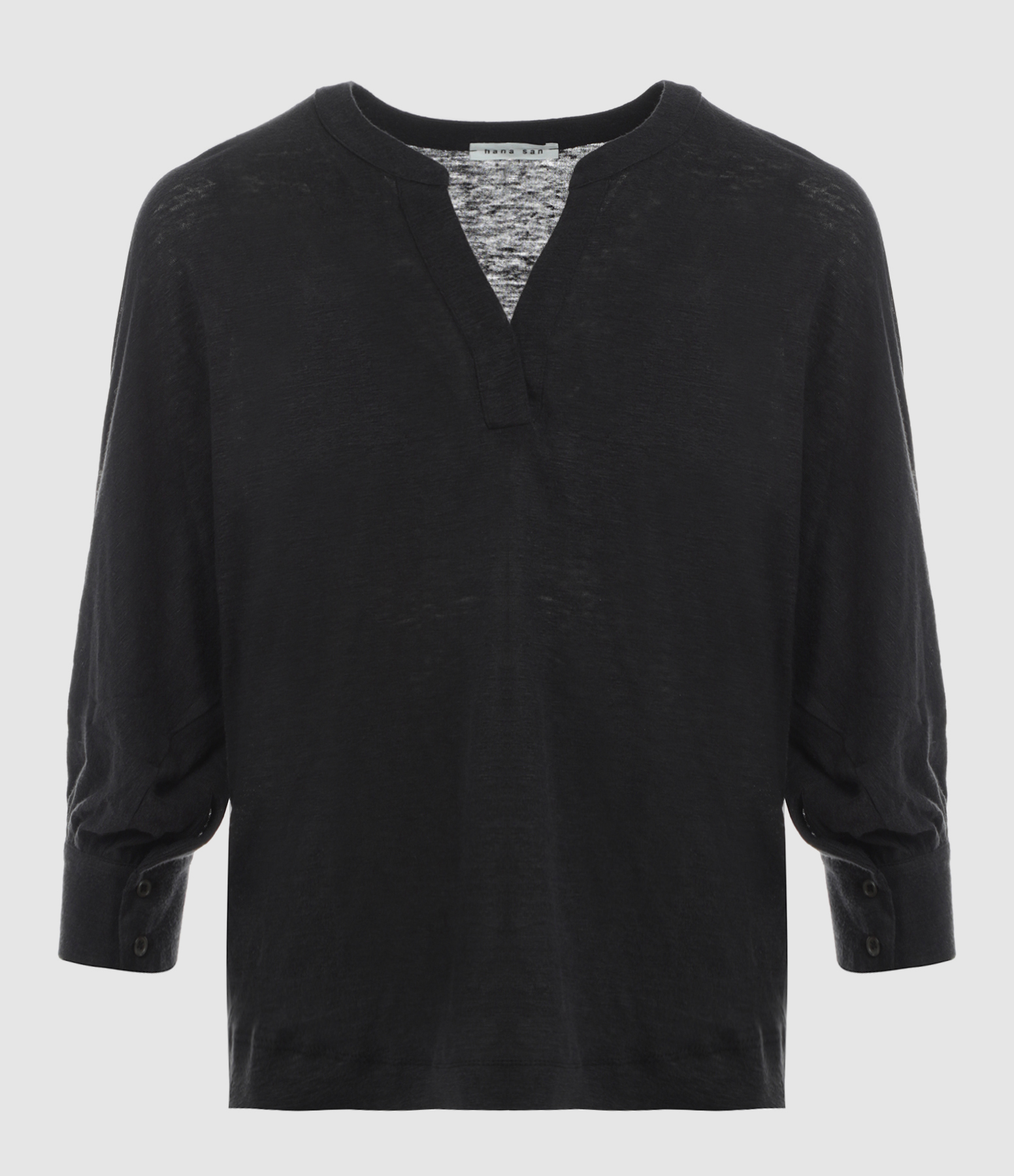 Blouse en lin noir. Col tunisien. Manches 3/4 chauve-souris. Coupe ample. Base arrondie.