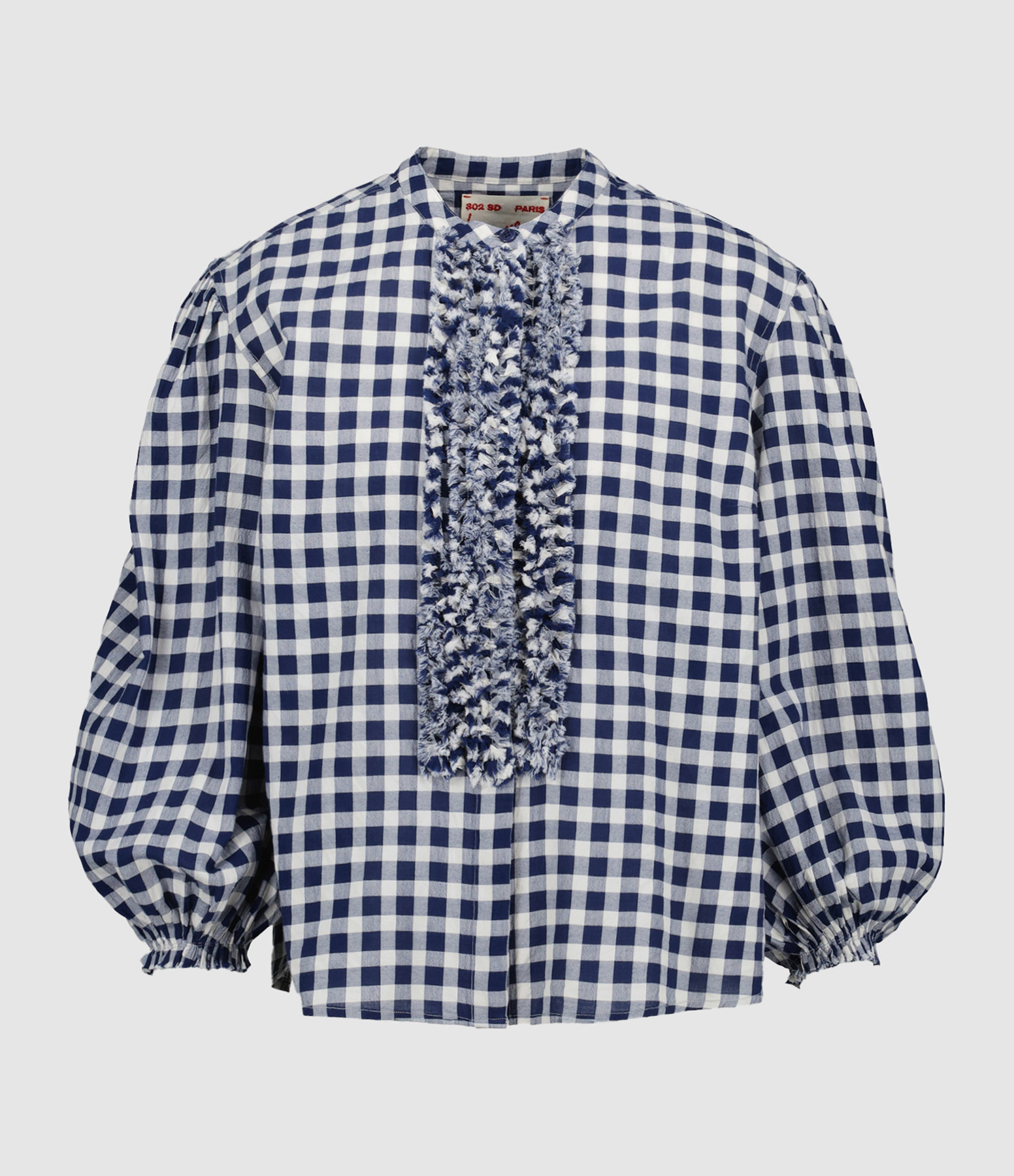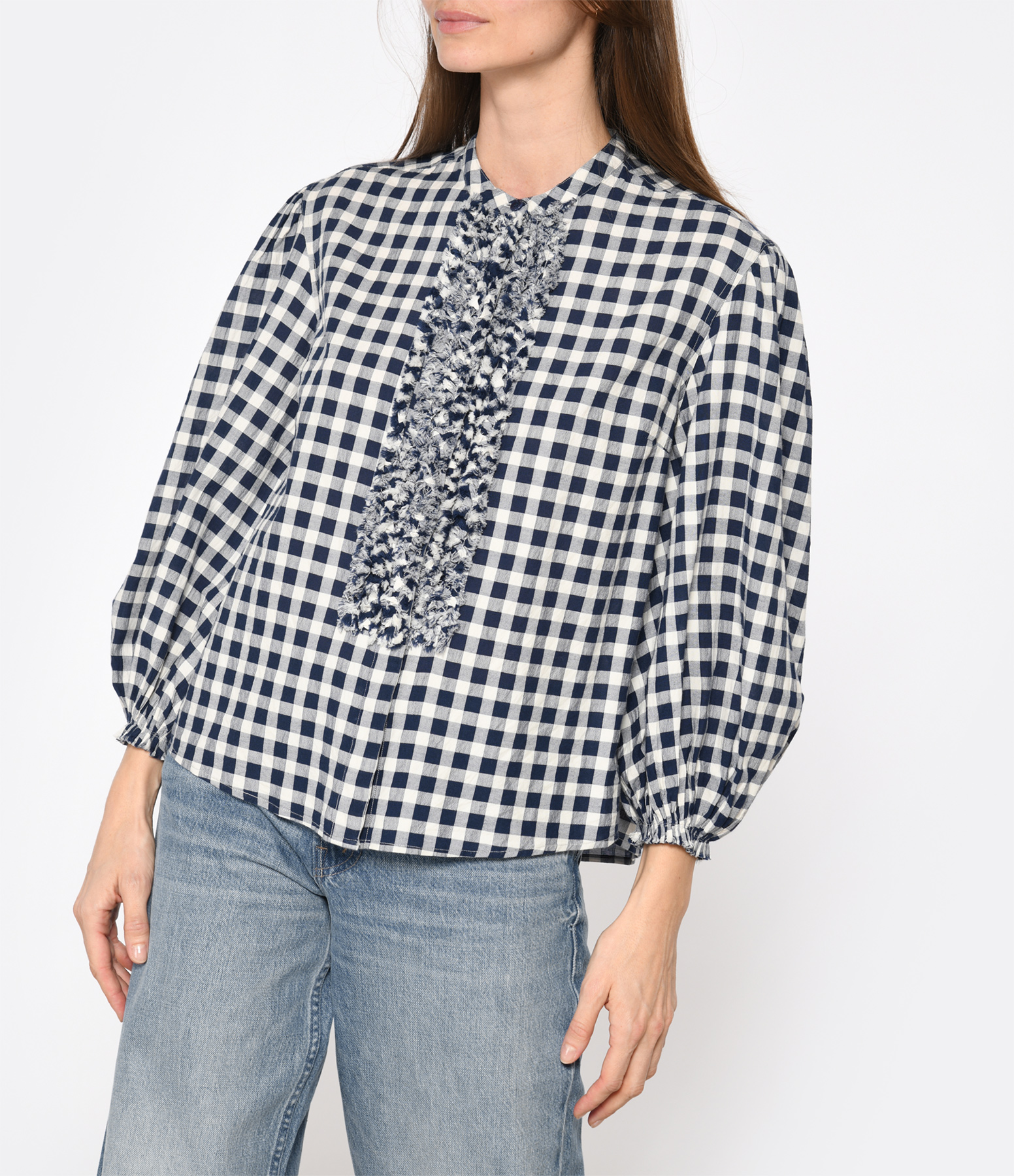 Blouse à carreaux bleus. Manches longues bouffantes élastiquées aux poignets. Col jabot. Pâte de boutonnage. Coupe droite ample.