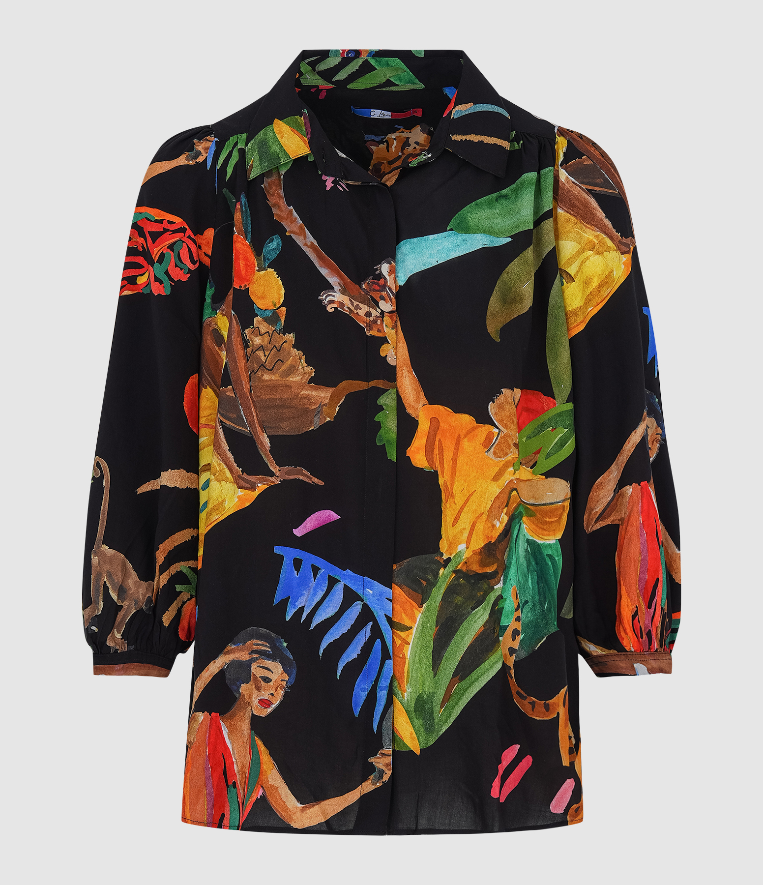 Blouse en viscose fluide à coupe évasée, manches 3/4 bouffantes et boutonnière dissimulée à l’avant. Imprimé “Nero Frutad”.