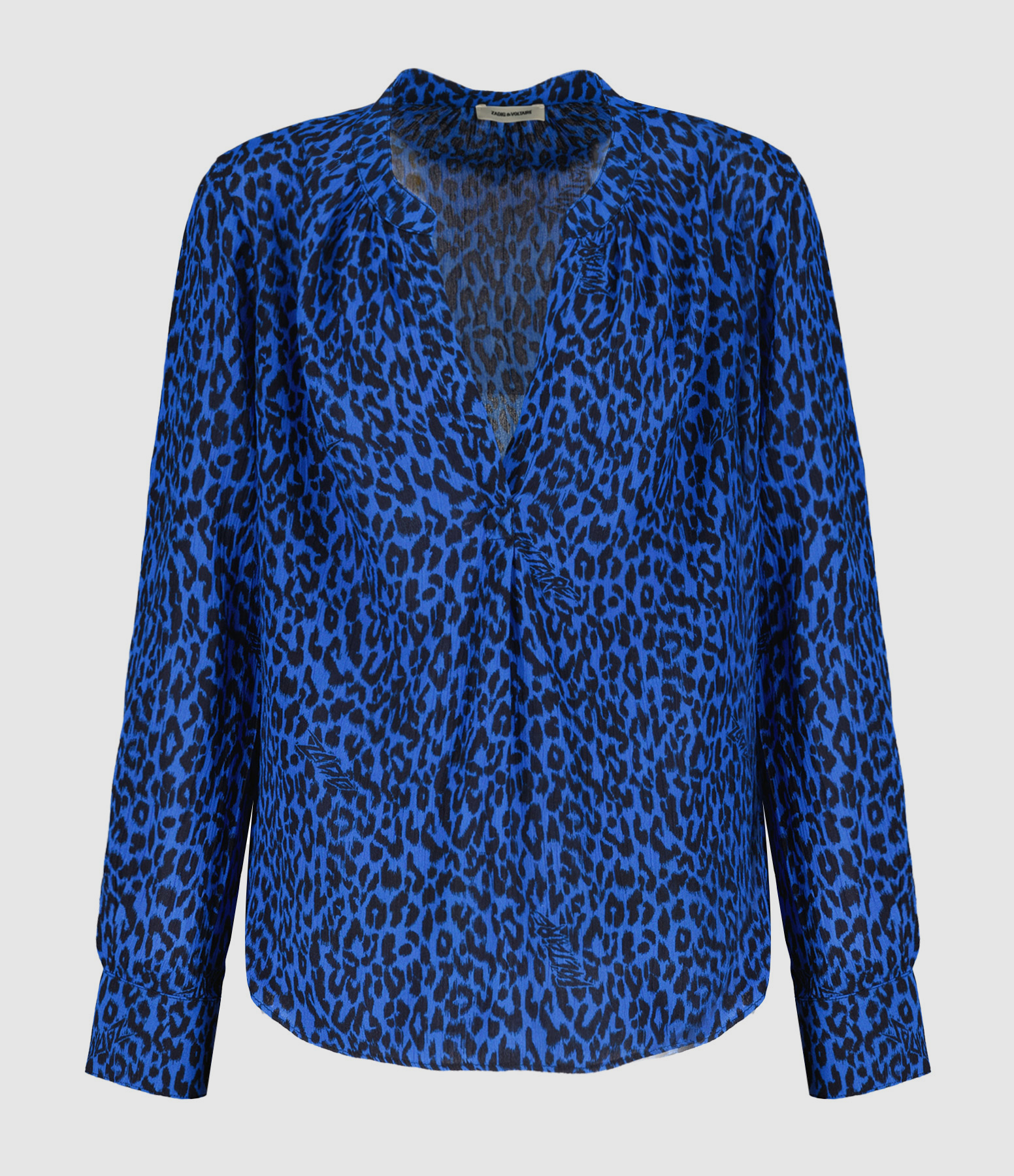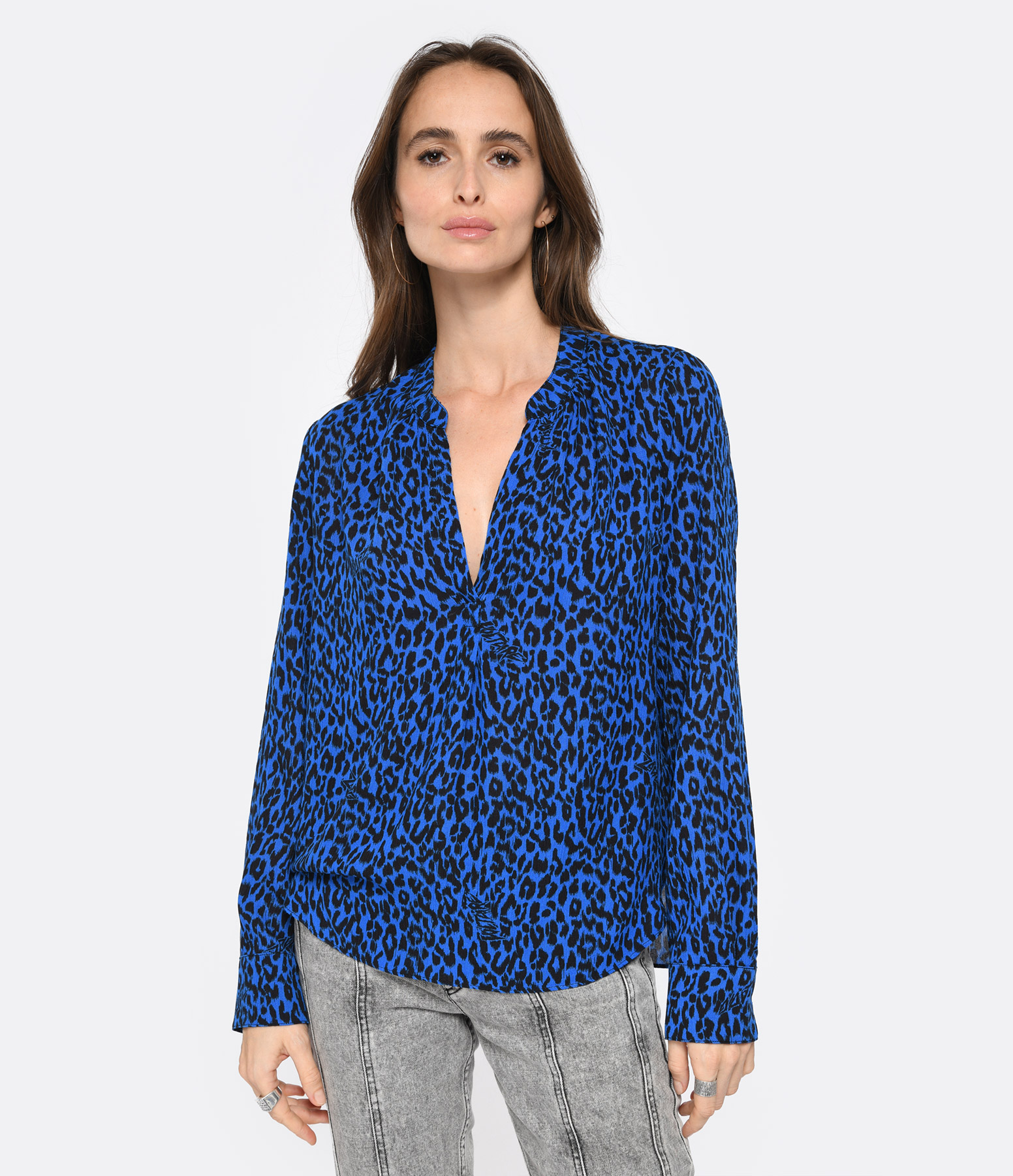 Chemise à imprimé léopard bleu et noir. Col V. Manches longues. Bouton aux poignets. Coupe droite. Base droite, plus longue à l'arrière.