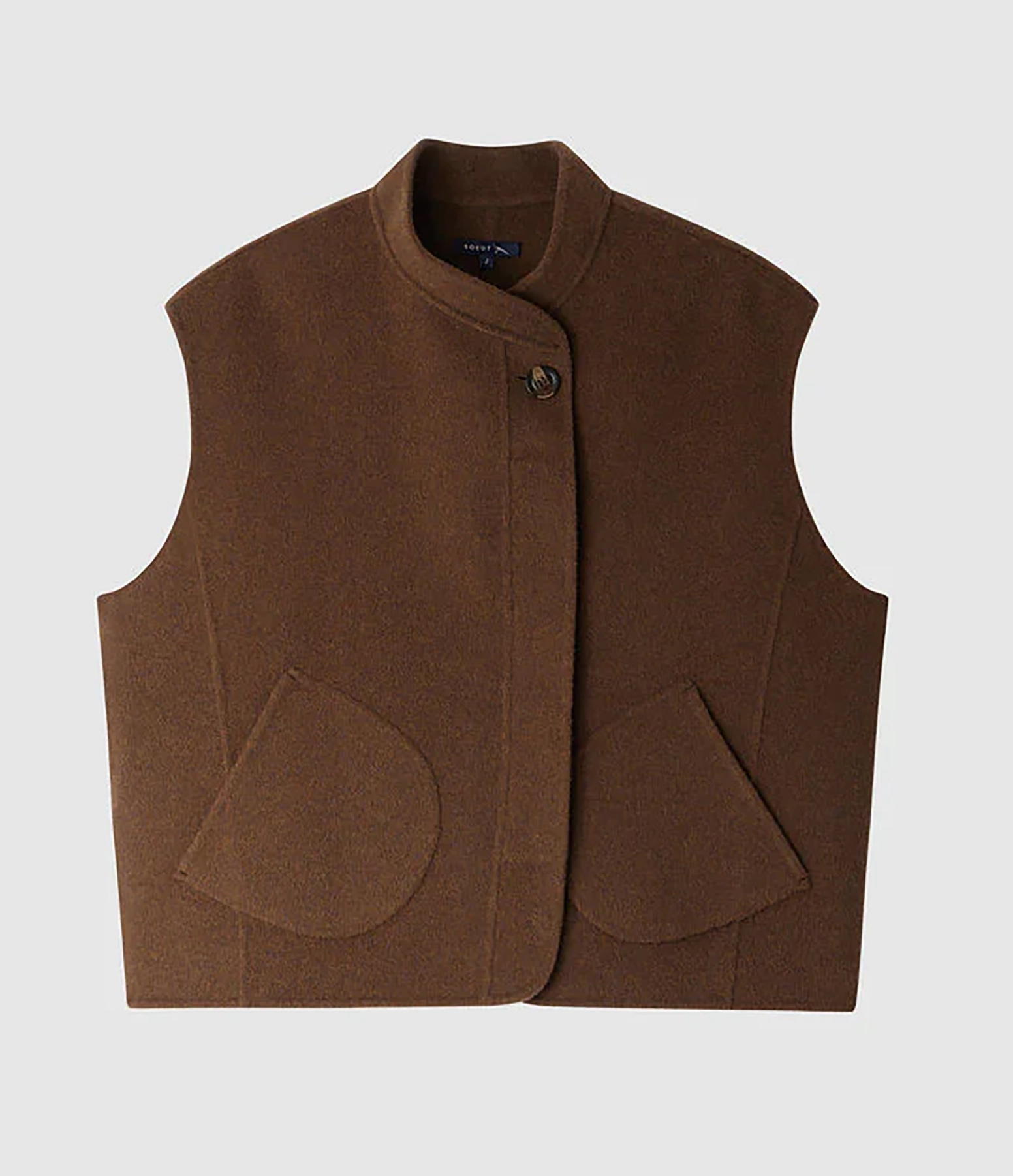 Blouson en laine mélangée marron sans manches. Coupe large droite. Col montant, asymétrique. Fermeture à boutons croisés dissimulés. Poches plaquées latérales.