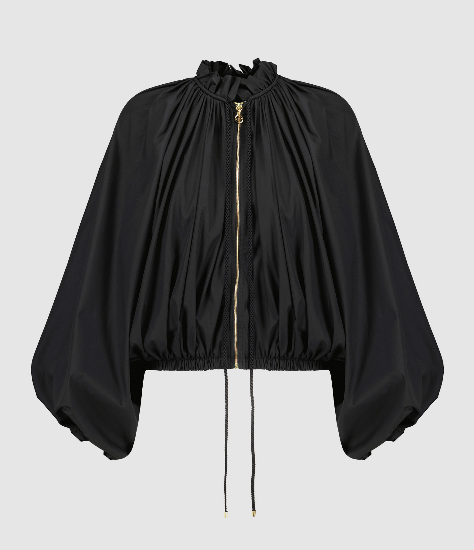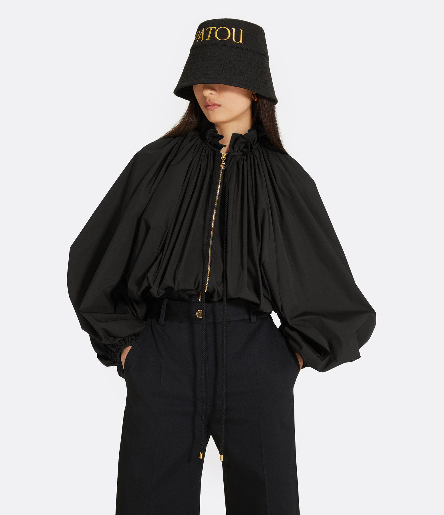 Bomber en coton bio mélangé noir. Plissé à l'avant et au dos. Col haut à volant. Coulisse en corde avec embouts dorés. Zip doré avec tirette JP signature. Manches ballon à poignets élastiqués. Taille élastiquée. Modèle léger pouvant aussi être porté en tant que blouse. Coupe courte et volumineuse.