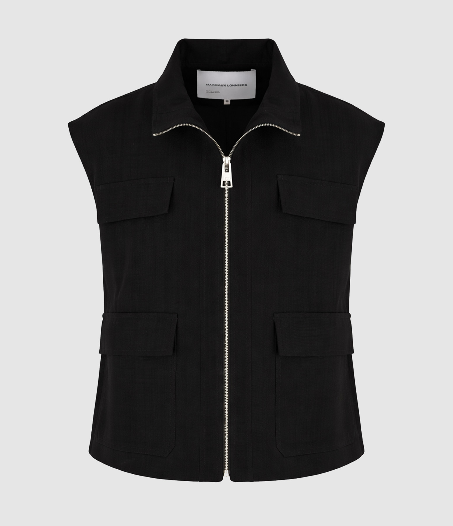 Veste sans manches à col montant, dotée d’une fermeture zippée sur le devant. Elle présente une coupe droite et ample avec des poches plaquées à rabat à l’avant, un pli d’aisance au dos, un bas droit et une longueur hanches.