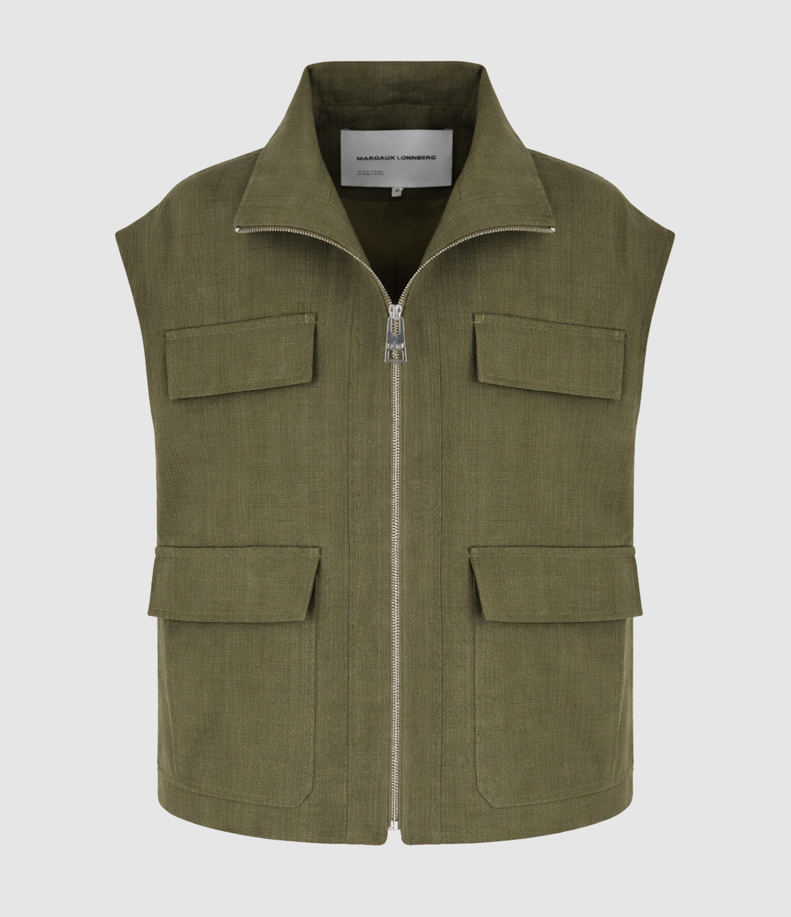 Veste sans manches à col montant, dotée d’une fermeture zippée sur le devant. Elle présente une coupe droite et ample avec des poches plaquées à rabat à l’avant, un pli d’aisance au dos, un bas droit et une longueur hanches.