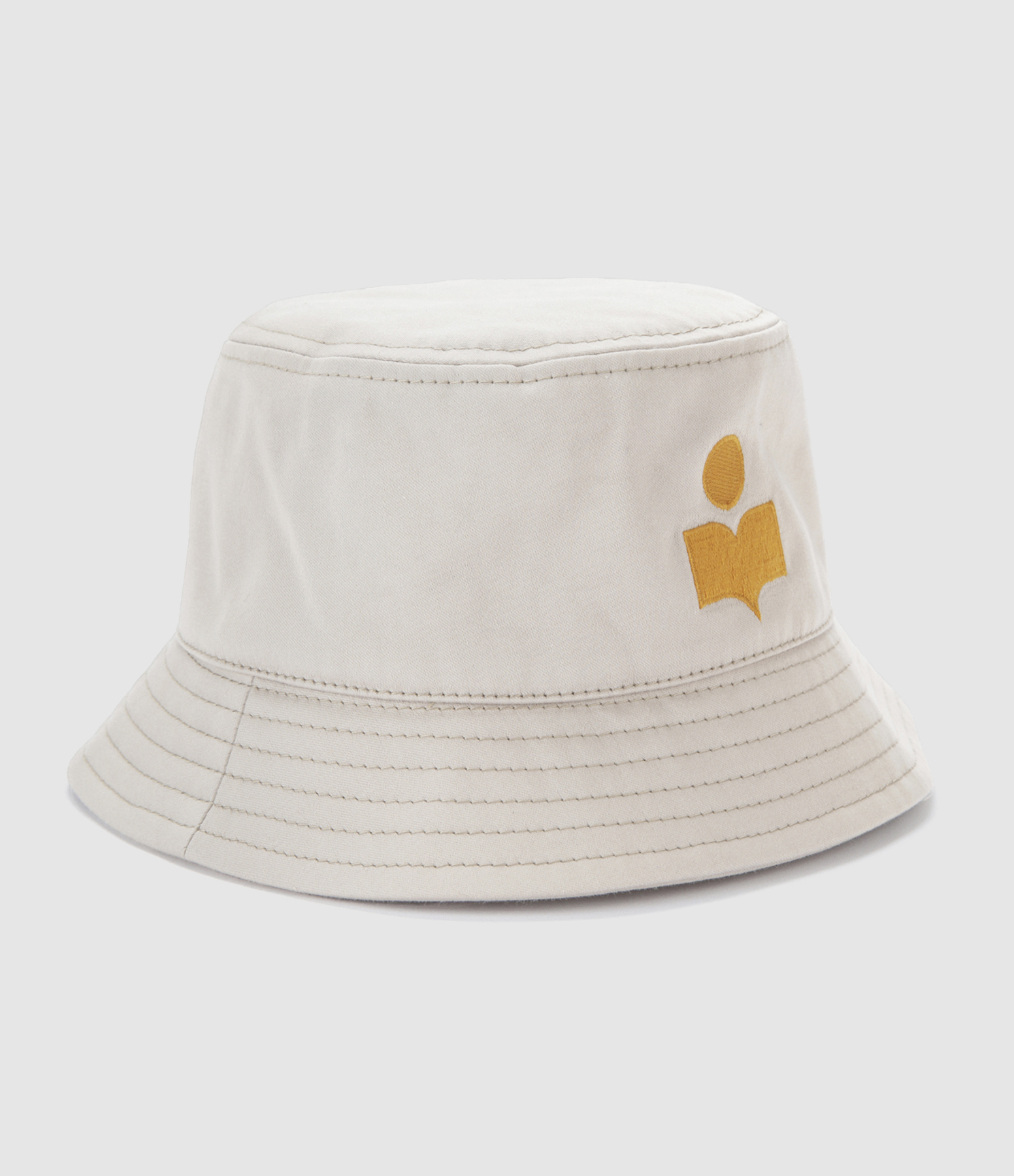 Chapeau bob en coton beige. Logo de la marque brodé sur le côté. Intérieur entièrement doublé.