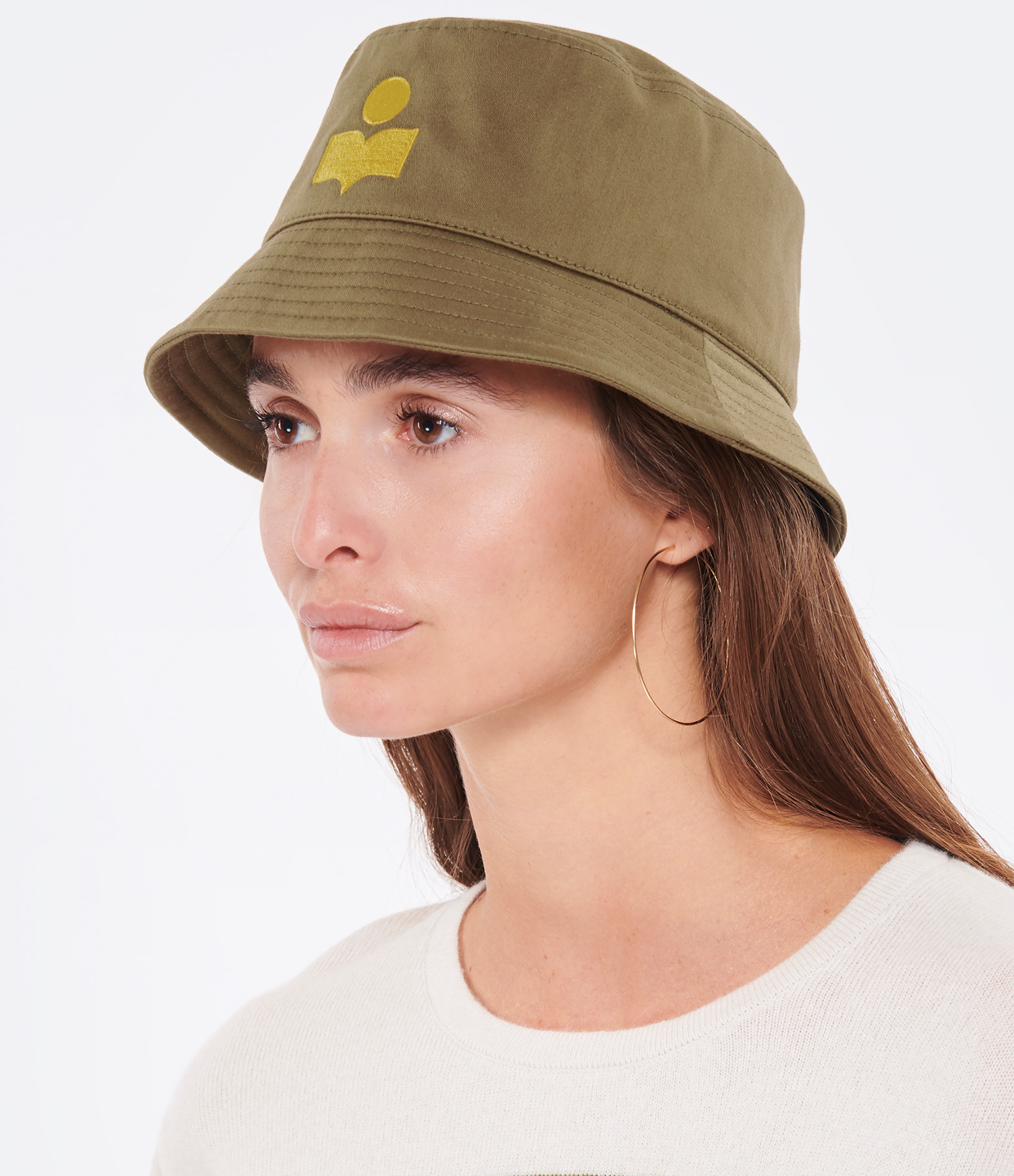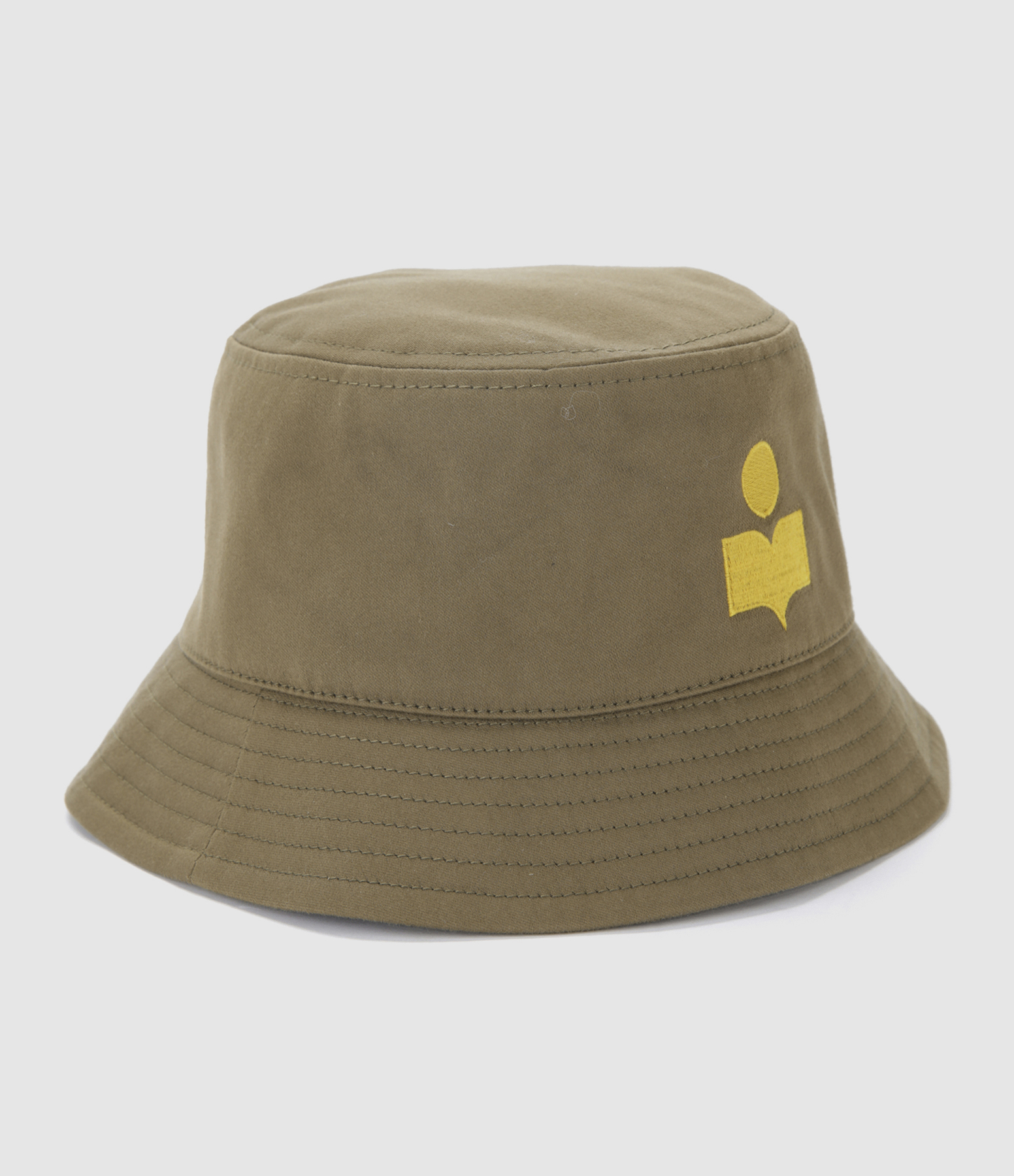 Chapeau bob en coton kaki. Logo de la marque brodé en jaune sur le côté. Intérieur entièrement doublé.