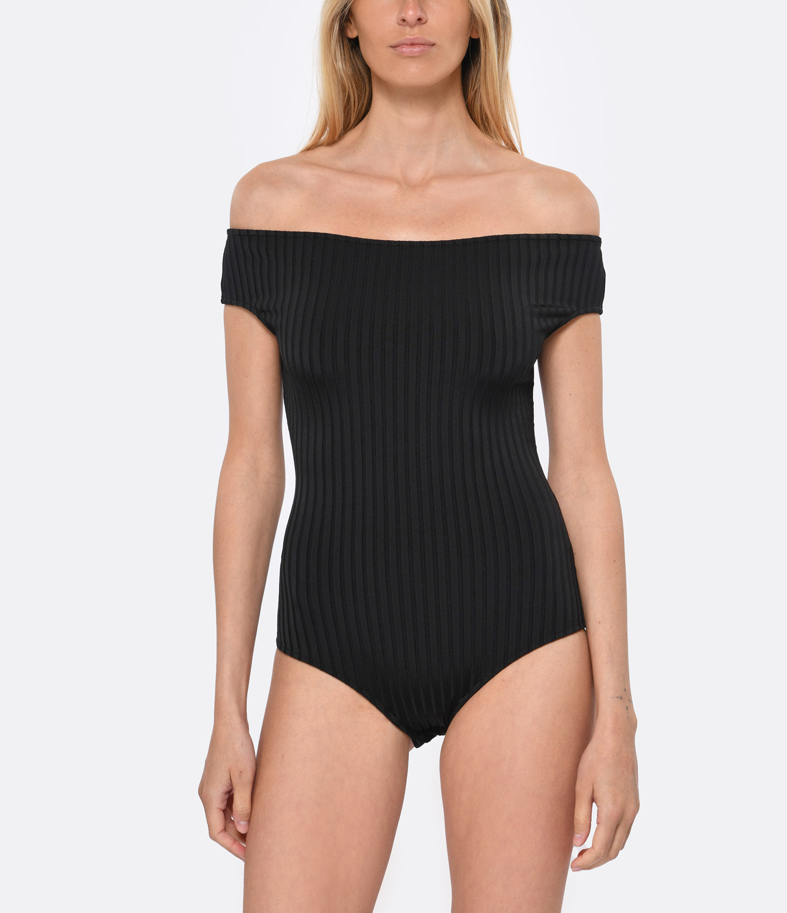 Body noir à épaules dénudées. Fermeture par boutons pression à l'entre-jambes. Fond doublé.