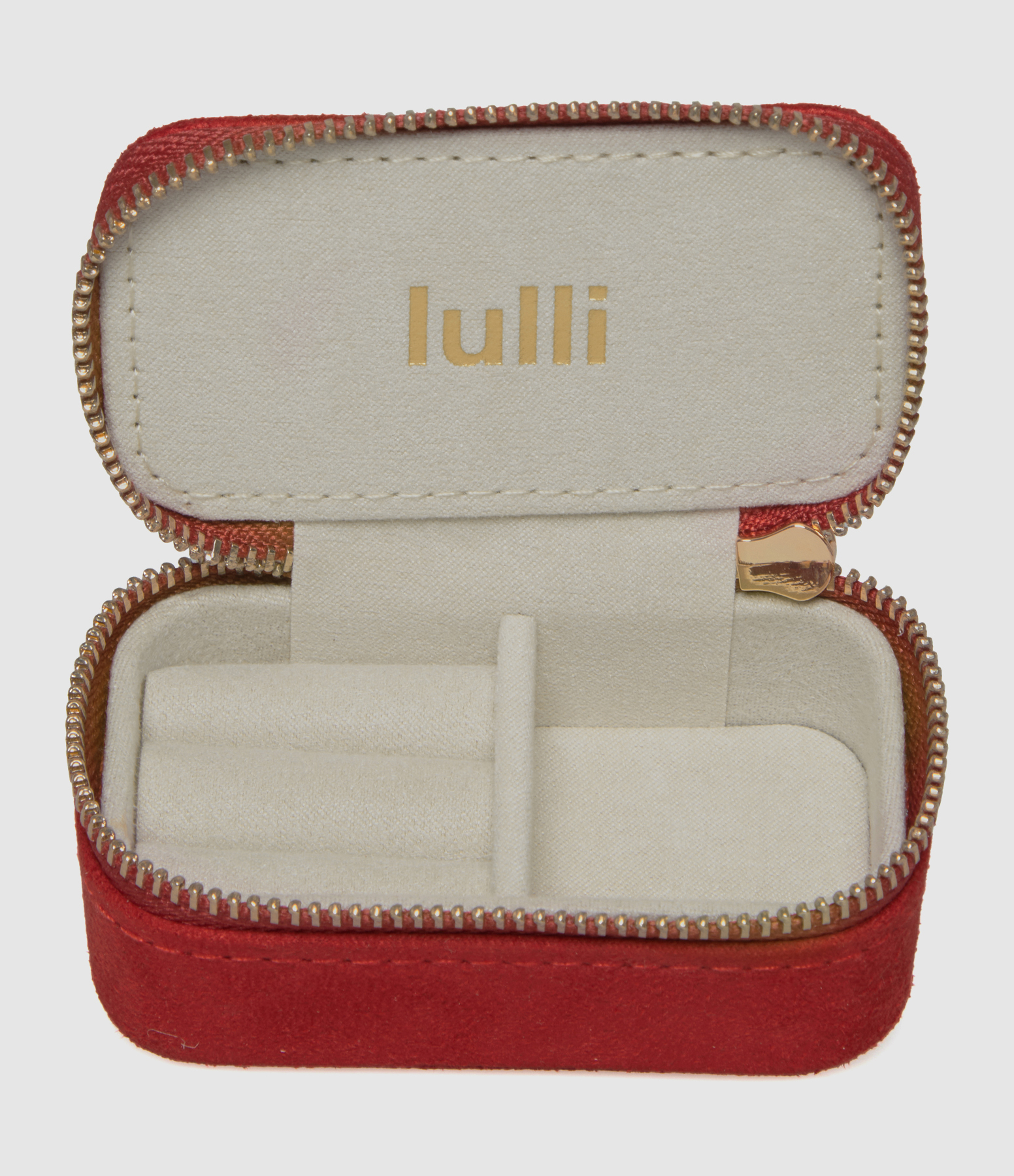 Boite à bijoux en velours rouge. Fermeture par zip. Deux compartiments vides, un compartiment avec rangements pour bagues et puces d'oreille et un pour colliers et bracelets.