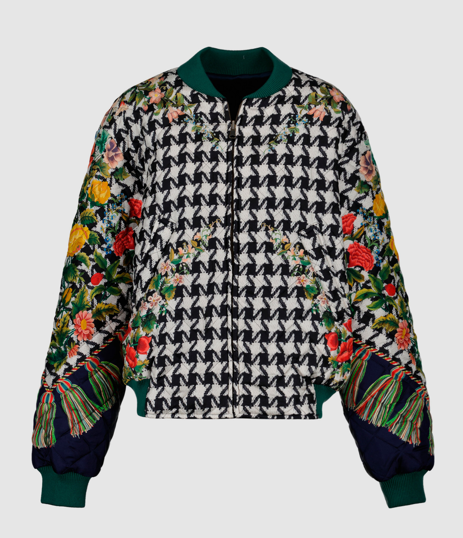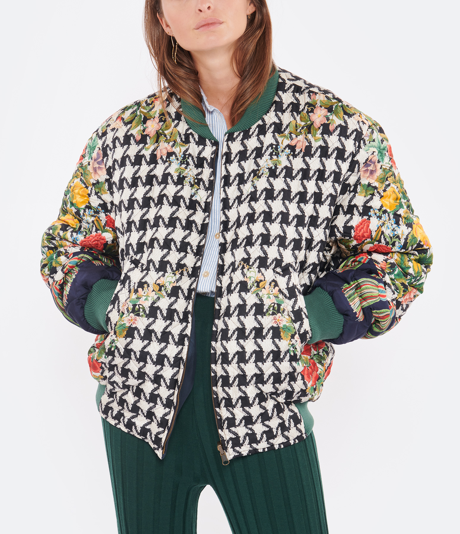 Veste bomber matelassée réversible en soie à imprimé fleuri multicolore d'un côté et tissus satin bleu de l'autre. Encolure arrondie côtelée. Manches longues avec poignets côtelés. Fermeture zippée sur le devant. Deux poches raglans sur le devant des deux côtés. Coupe droite. Base droite côtelée.