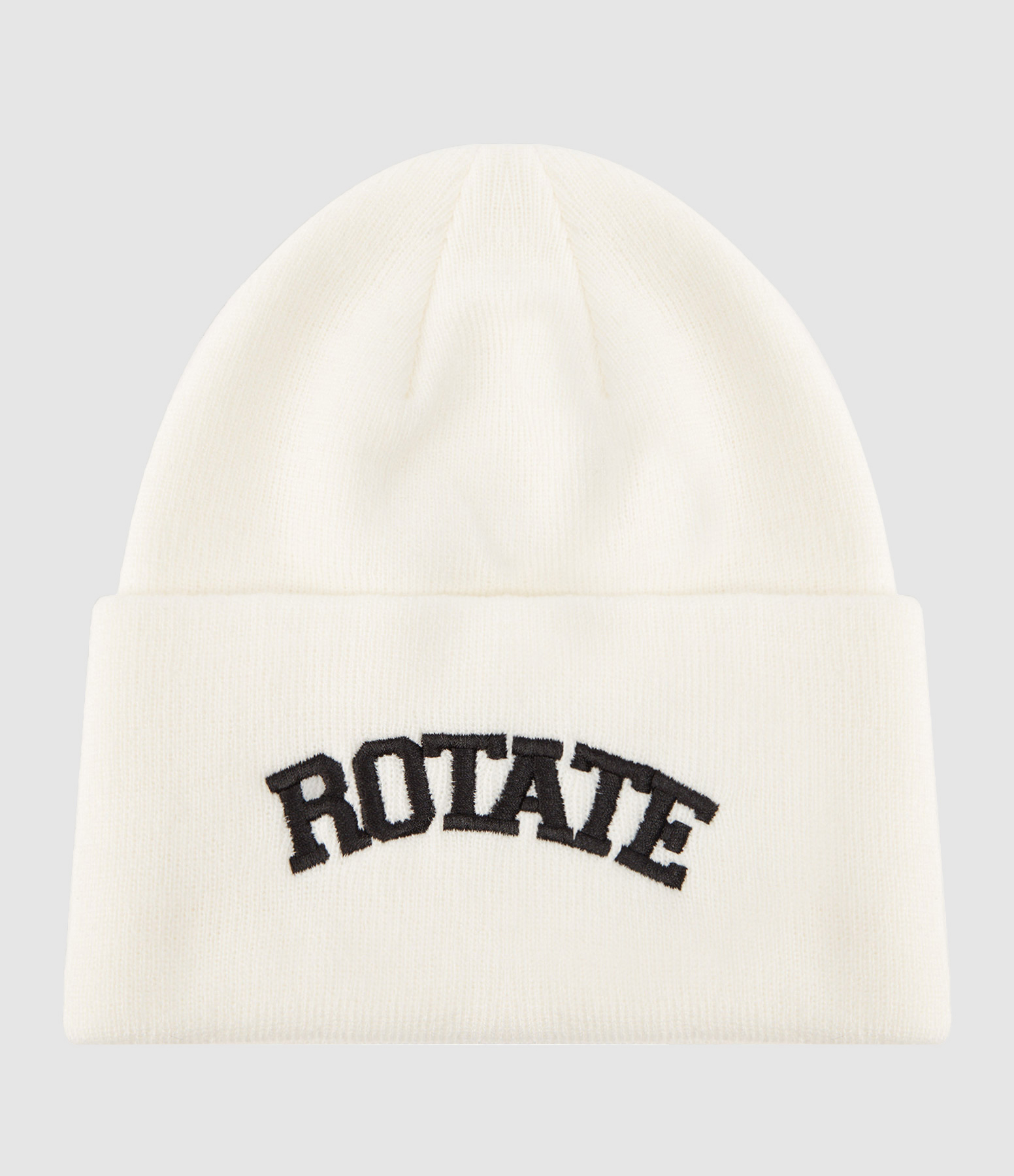 Bonnet côtelé blanc avec revers. Inscription "ROTATE" brodée sur le revers.