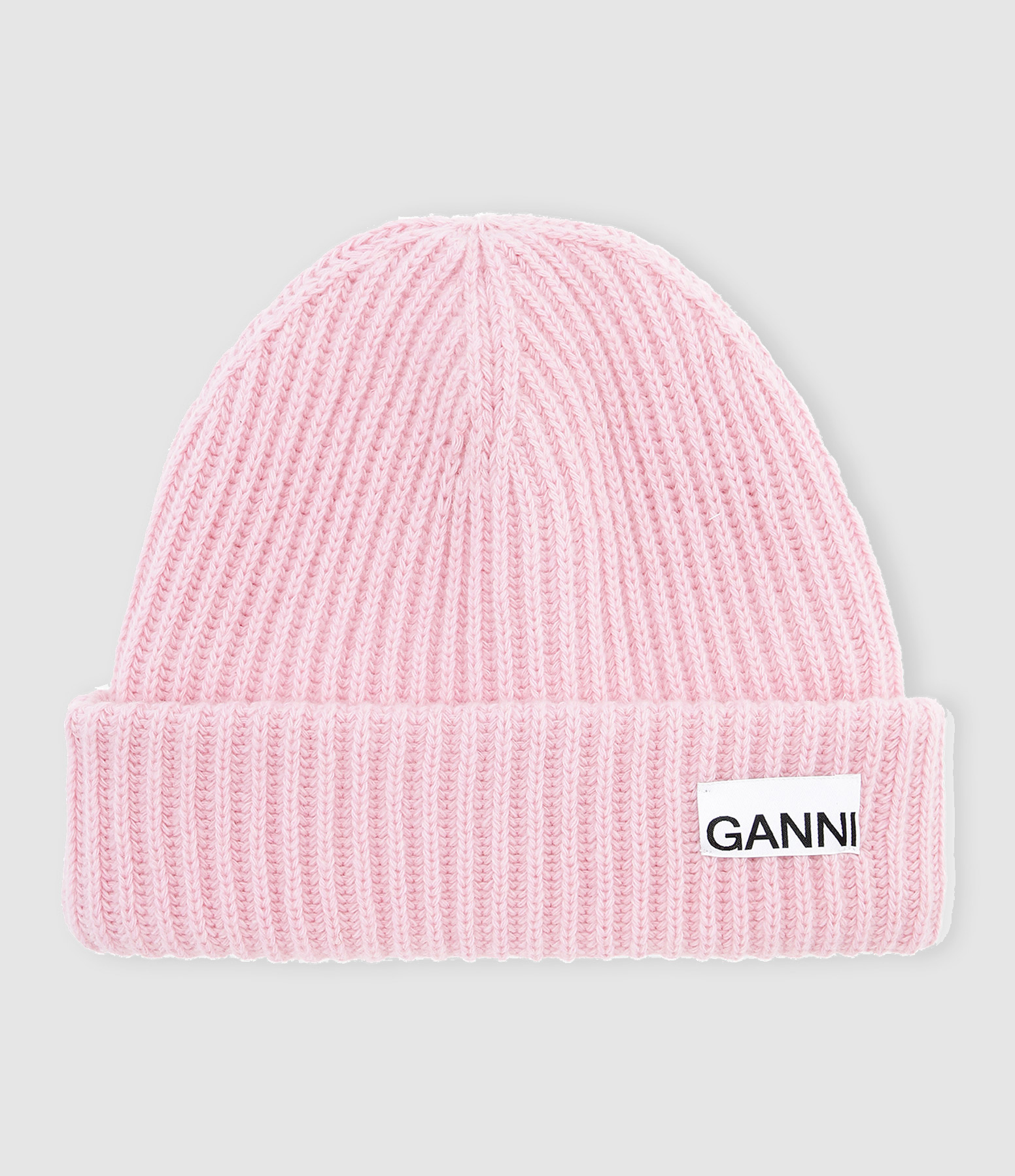 Bonnet épais en laine avec étiquette GANNI décentrée. Revers non cousu.