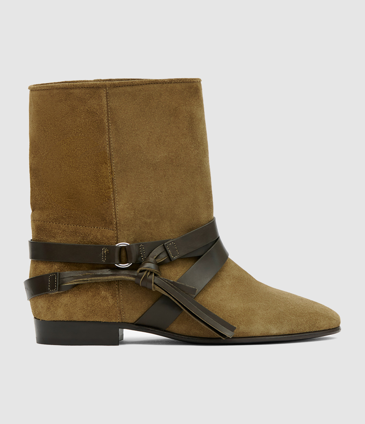 Bottines en cuir suédé vert. Lanières en cuir lisse et détail anneau doré.