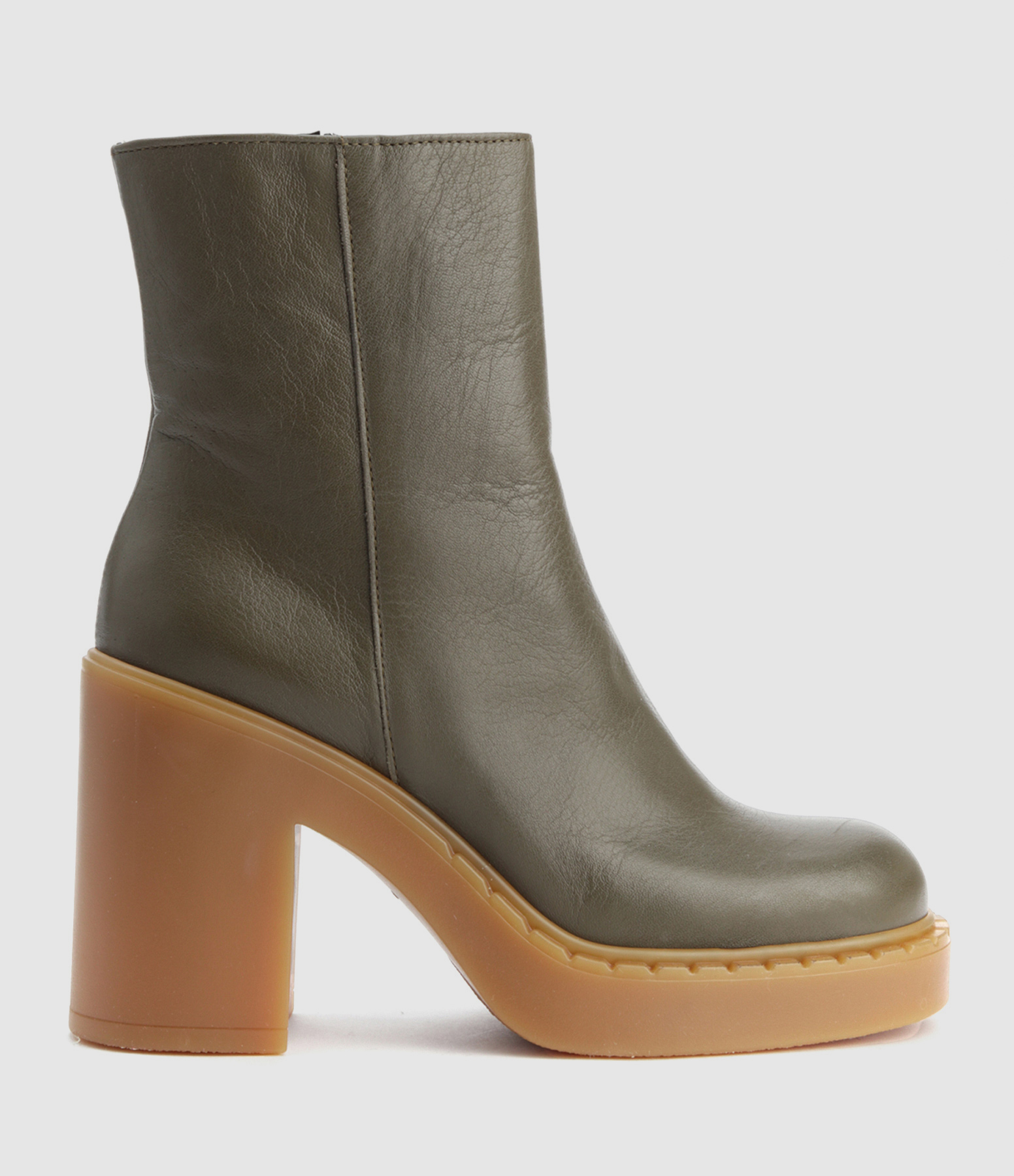 Bottines à talons en cuir lisse kaki. Talons blocs. Bouts arrondis avec trépointes prononcées. Fermeture zippée sur le côté.