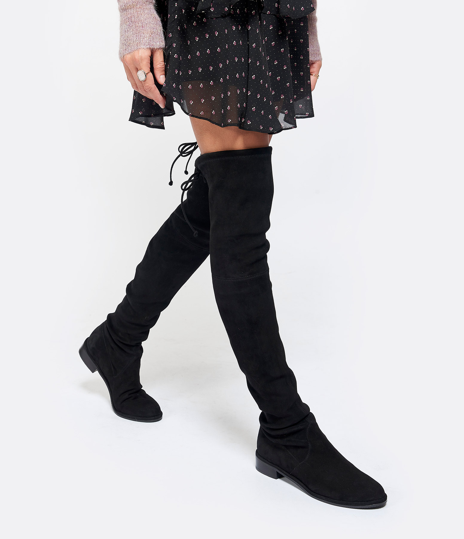 Cuissardes en cuir suédé noir. Liens de serrage à nouer à l'arrière. Talons bloc plats. Bouts en amande.