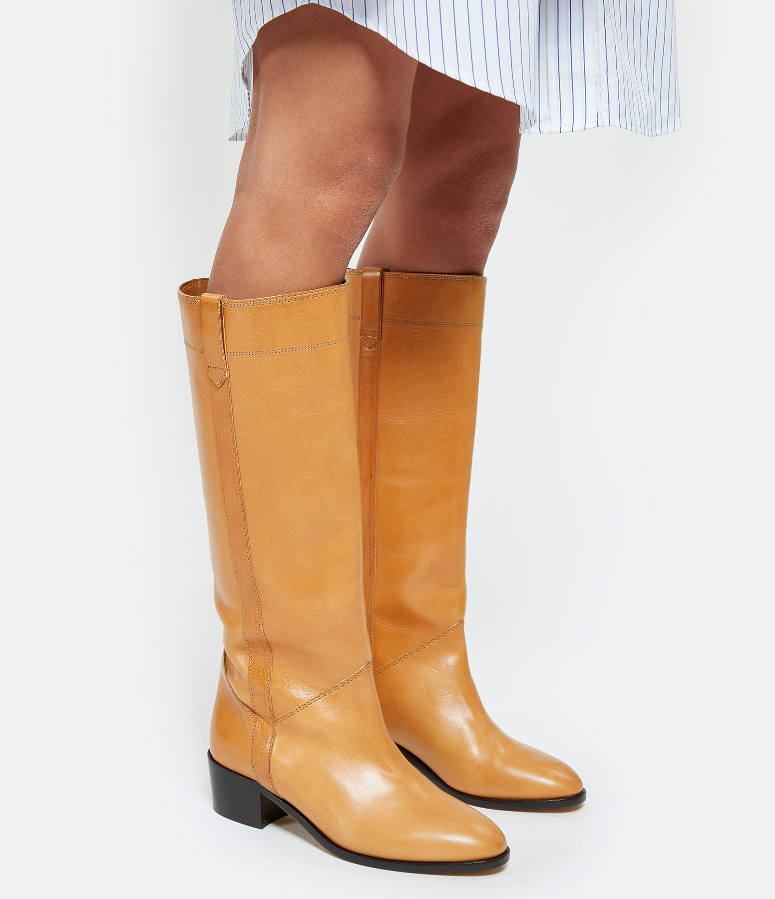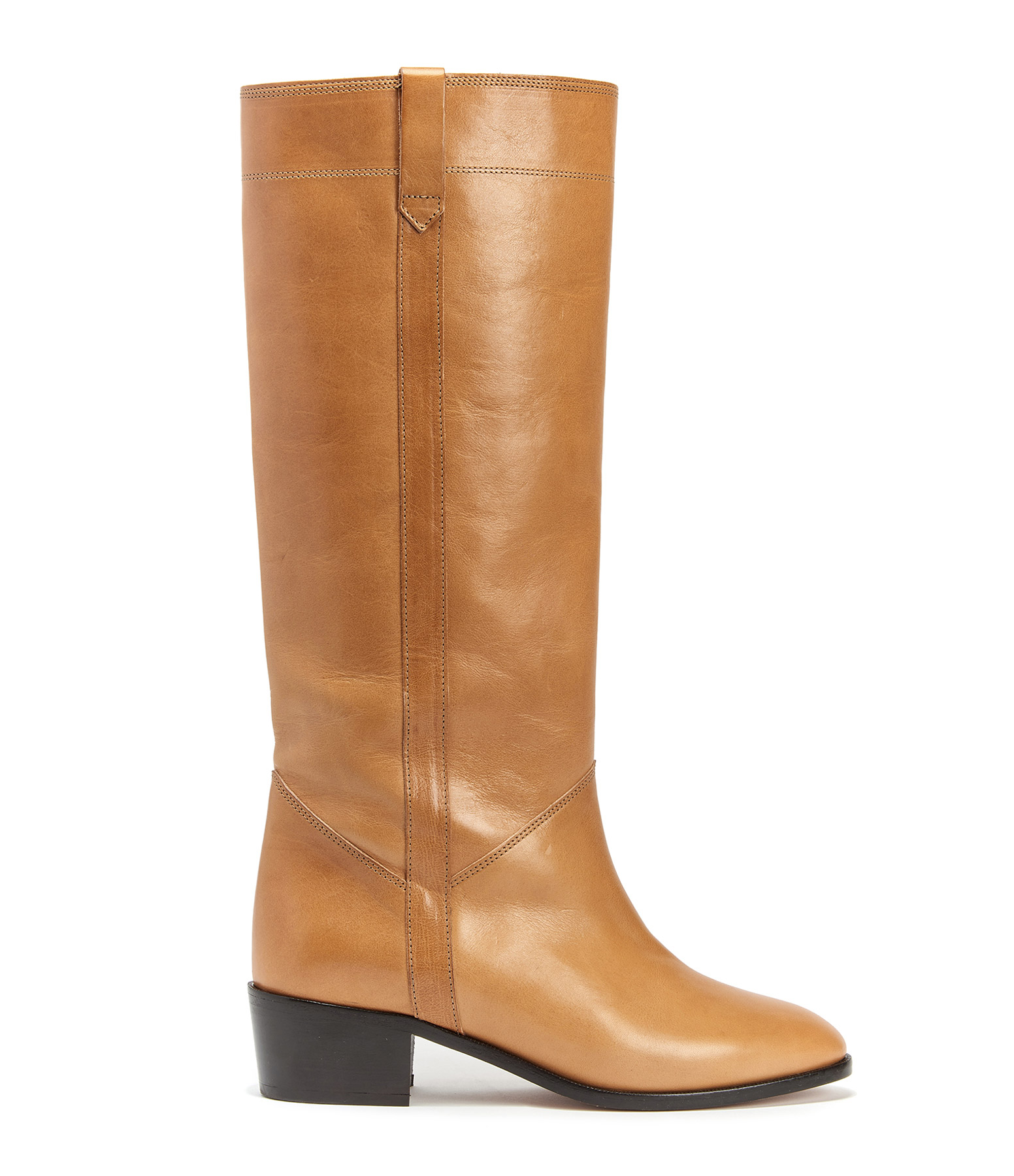 Bottes en cuir lisse marron naturel. Jeux de découpes et de coutures. Talons bottiers. Bout pointu.