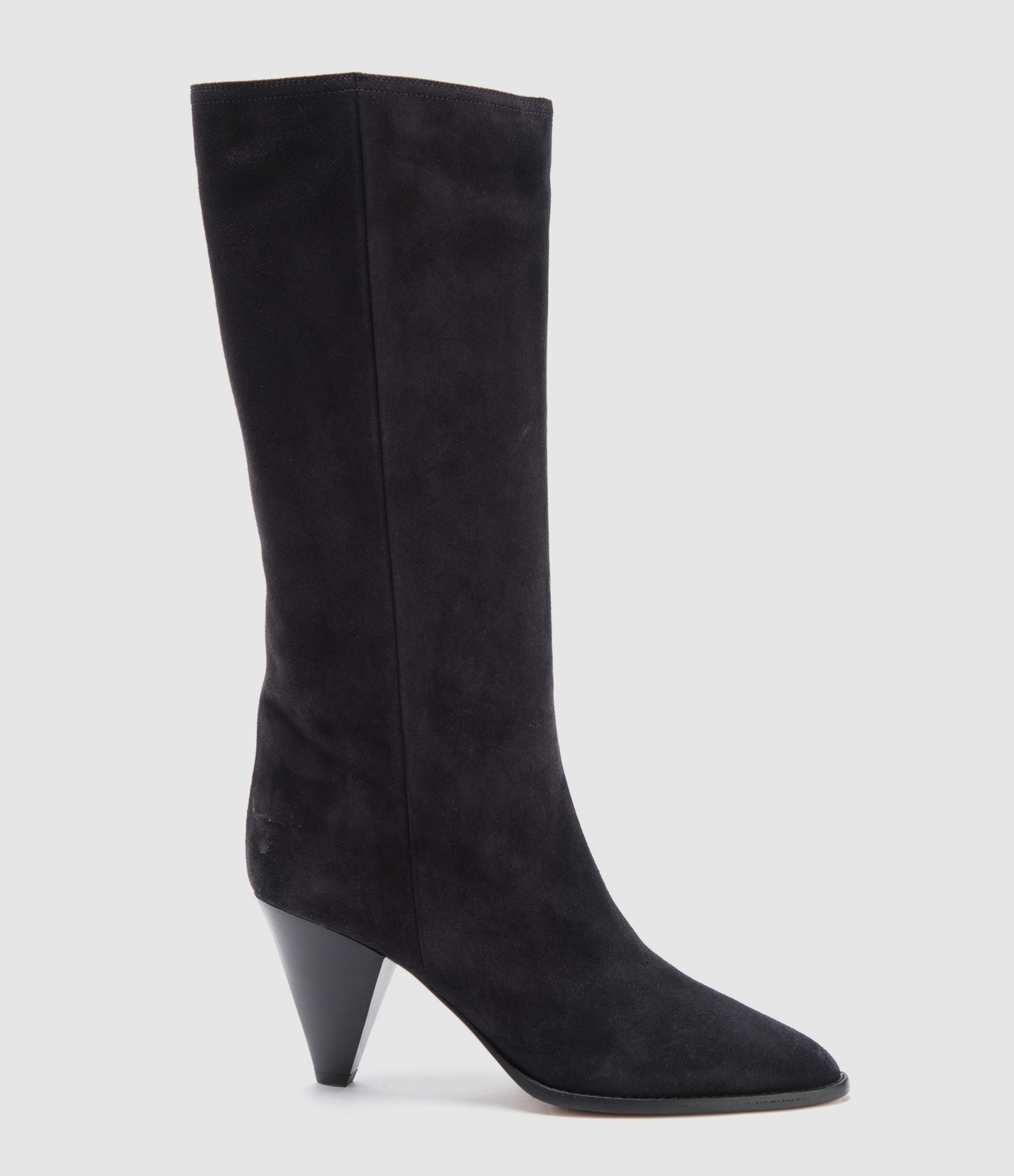 Bottes en cuir suédé noir. Bouts pointus. Intérieur doublé en cuir lisse. Talons cônes.