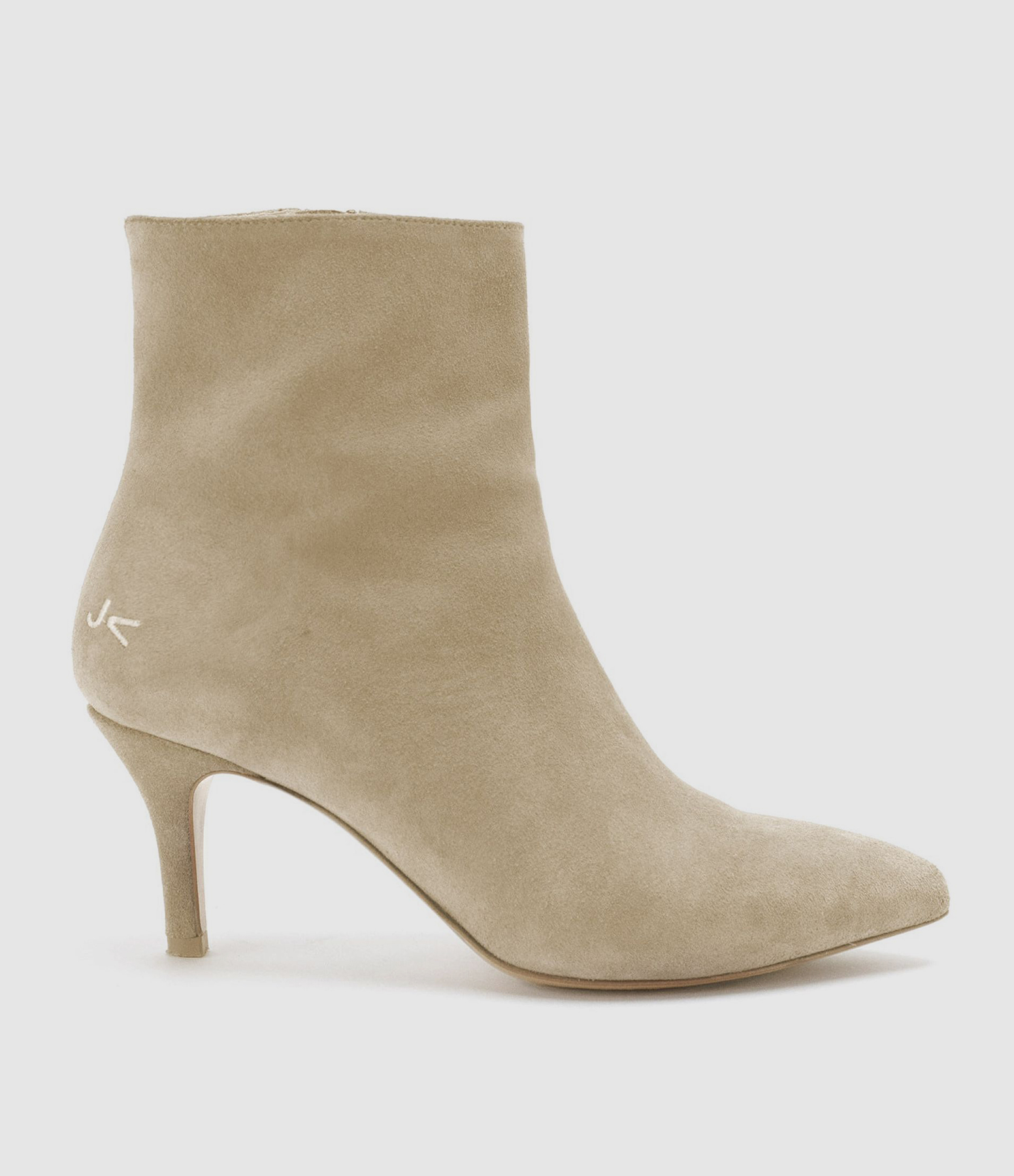 Bottines à talons en cuir suédé beige. Bouts pointus. Logo "JV" brodé à l'arrière.