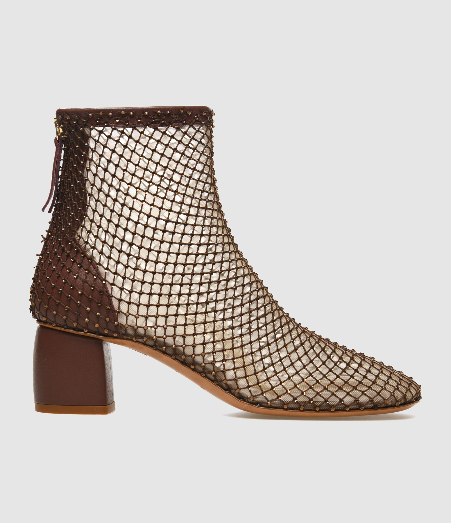 Bottines en résille marron et strass. Talons carrés. Fermeture par zip à l'arrière.