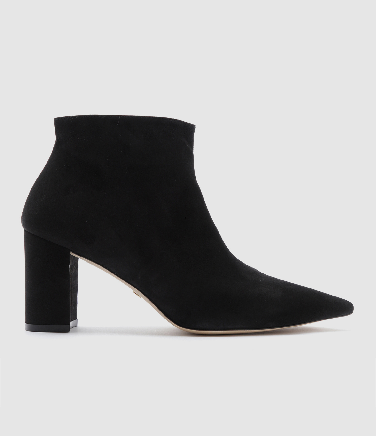 Bottines à talons en cuir suédé noir. Fermeture zippée latérale. Talon bottier. Bout pointu.