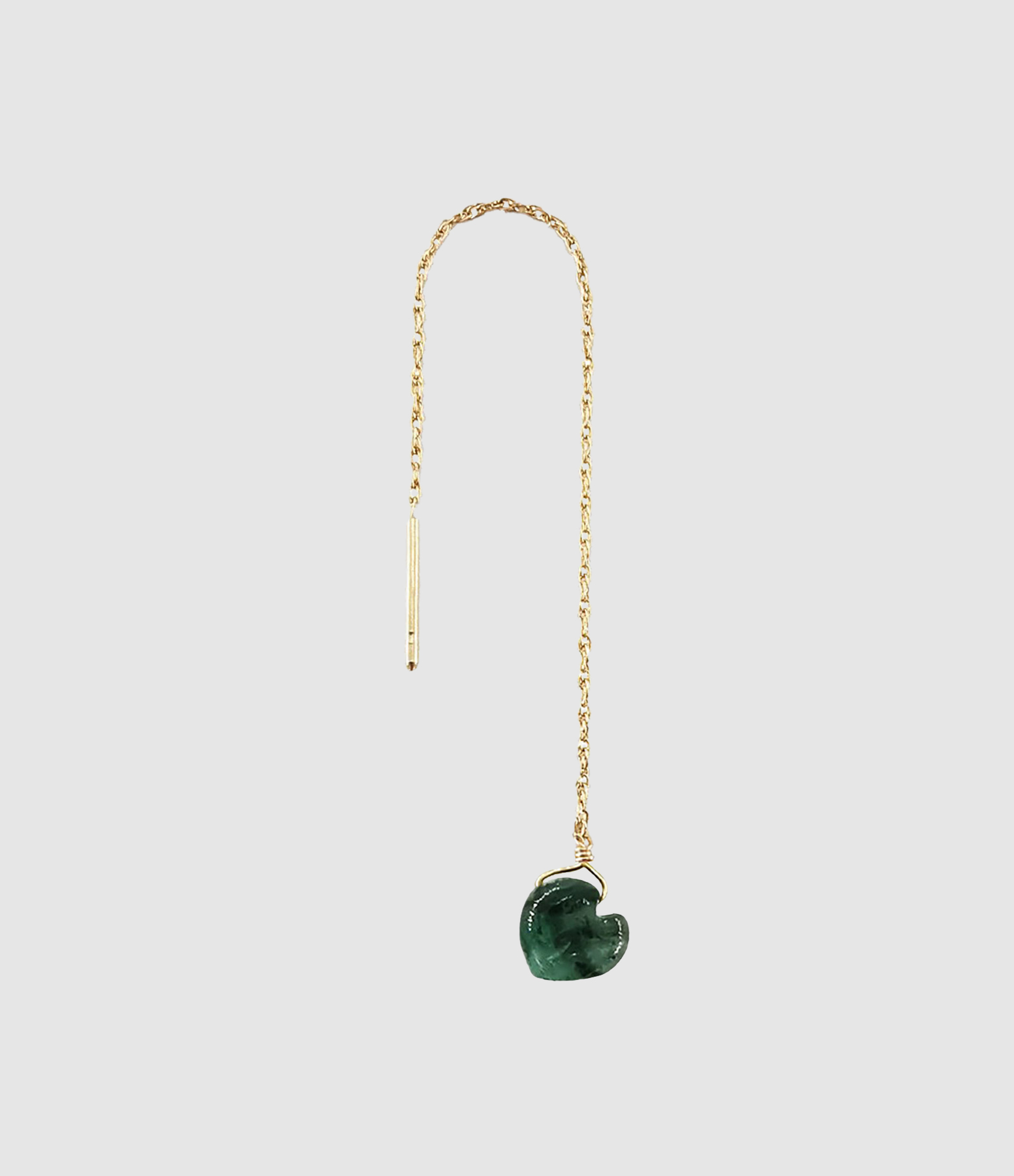 Boucle d'oreille chaîne, ornée d'une petite pierre d'Émeraude en forme de cœur. À porter en pendante ou à tisser si vous avez deux piercings de votre oreille.