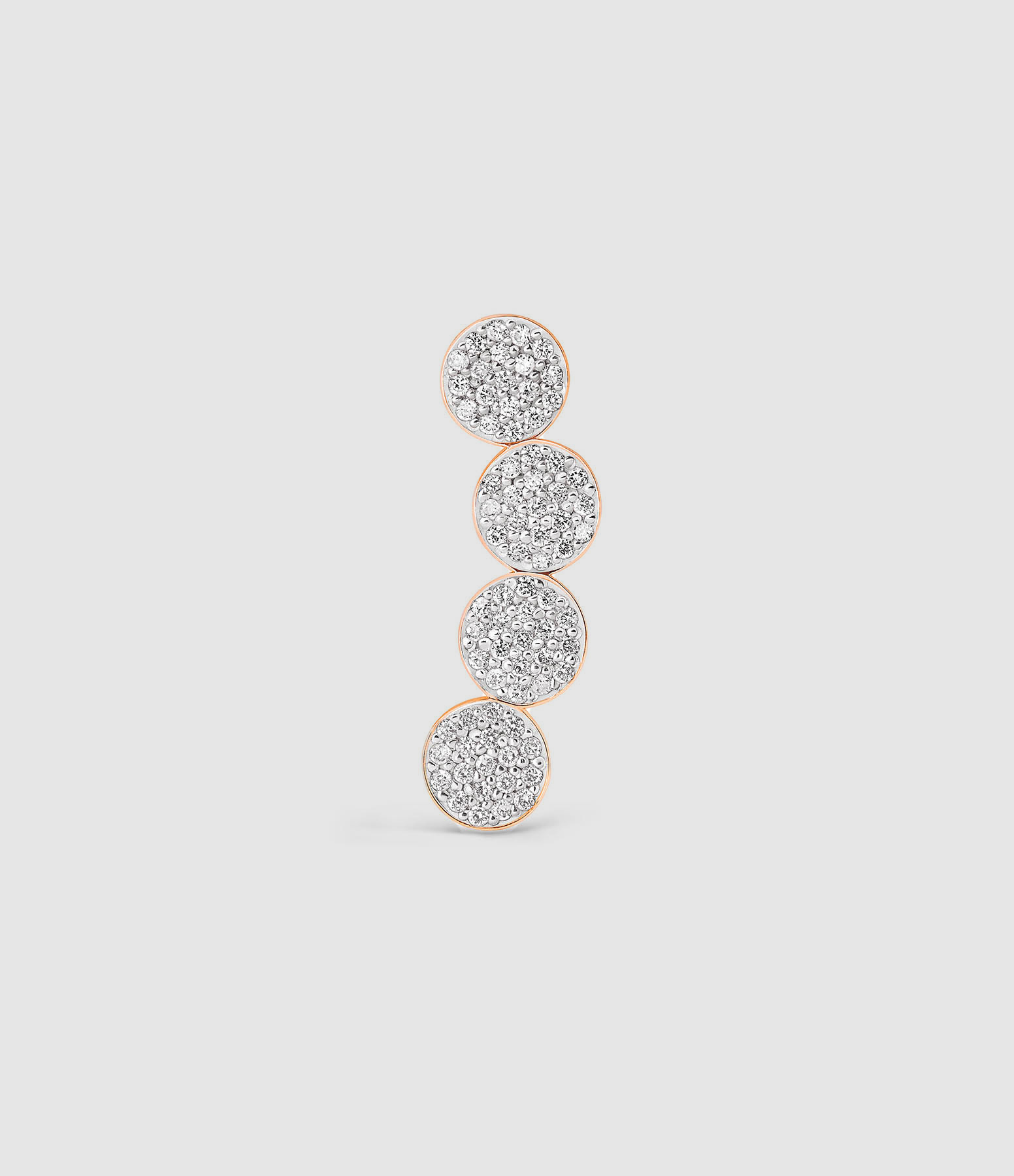 Boucle d'oreille gauche en or rose, 4 petits disques ornés de diamants. Pas de fermoir, tige à passer dans le lobe. Vendue à l'unité.