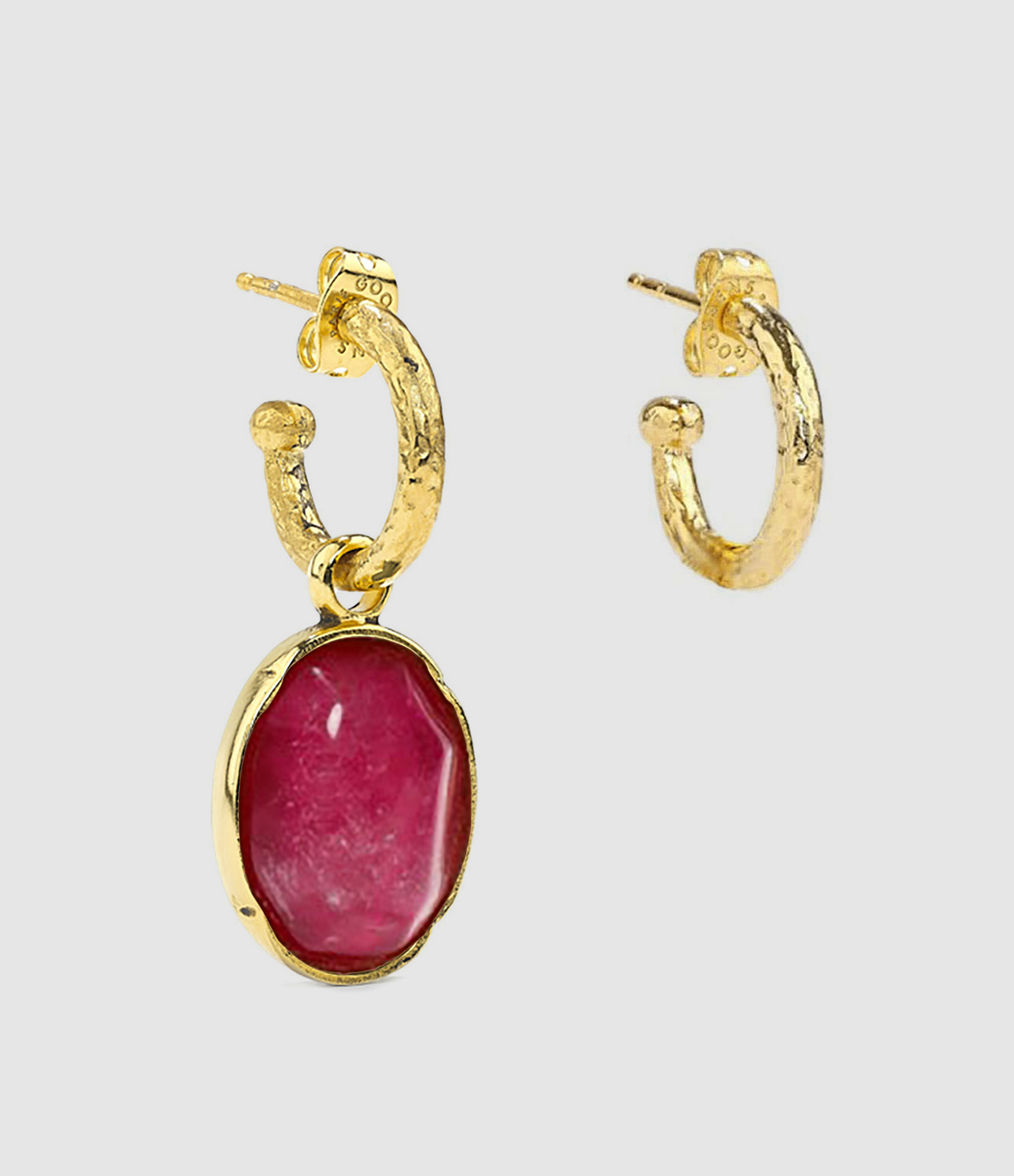 Boucle d'oreille en laiton trempé dans un bain d'or 24 carats, couleur or jaune, ornée d'un cabochon en cristal de roche teinté rubis indien.