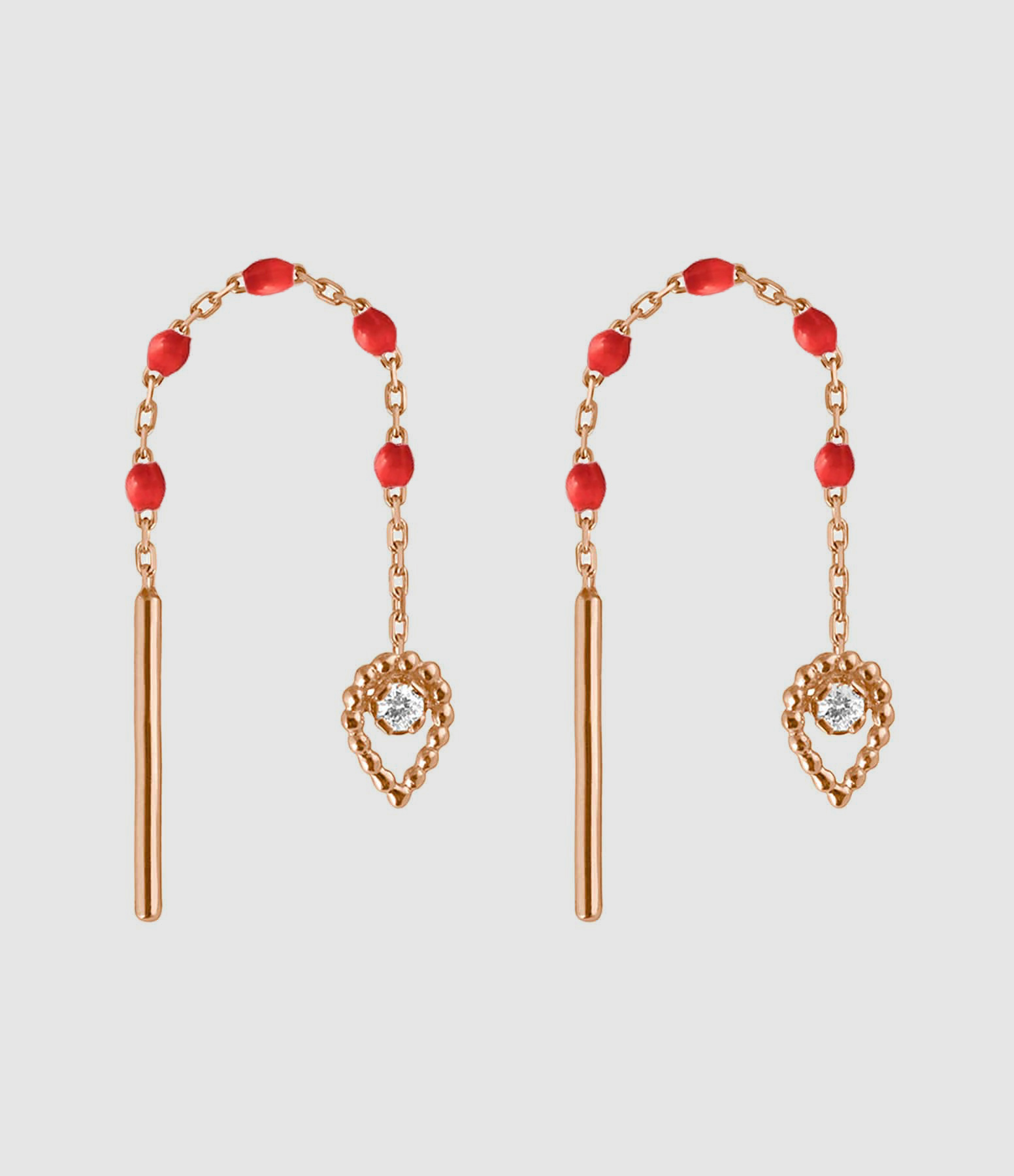 Boucles d'oreilles pendantes serties de deux diamants blancs et agrémentées de mini perles de résine.La fabrication de ce modèle est limitée aux 6 couleurs de résine présentées.