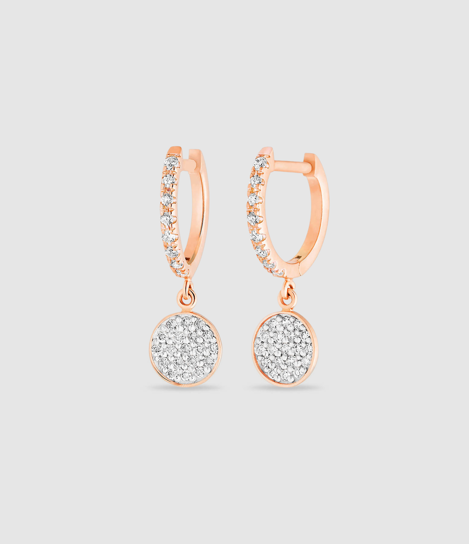 Mini créoles en or rose demi-pavée de diamants blancs, avec pendentif disque serti de 19 diamants.